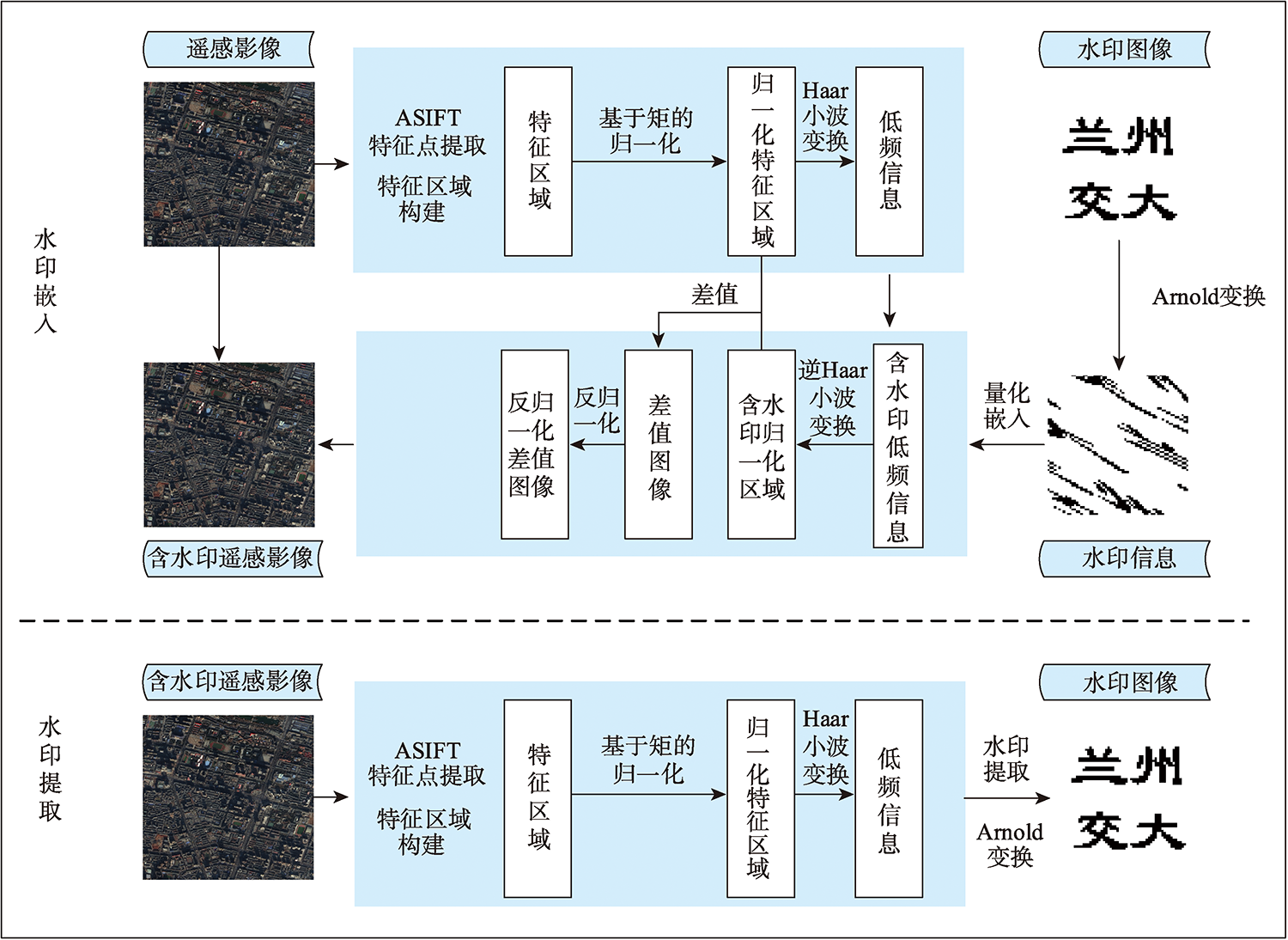 针对遥感影像使用过程中,含水印影像经过仿射变换后水印与影像的同步性被破坏,导致水印无法正常检测的问题,本文提出了一种适用于遥感影像的抗仿射变换盲水印算法。首先通过ASIFT算法提取影像具有仿射不变性的特征点,根据特征尺度的大小与特征点间的欧式距离筛选适量特征点,构造对应的正方形特征区域;然后通过计算特征区域的仿射不变矩得出归一化变换函数的参数,对特征区域进行归一化处理,并以归一化特征区域的不变质心为中心提取子区域作为水印嵌入区域,对该区域进行二级离散小波变换,得到水印嵌入区域的低频信息;运用量化嵌入规则将水印嵌入到低频信息中,依次进行低频信息逆小波变换,水印嵌入前后特征区域差值图像反归一化,最后将反归一化差值图像叠加在原始影像特征区域上,完成水印的嵌入。实验选用了3000像素×3000像素的高分二号遥感影像作为载体影像,含版权信息的二值图像作为水印,实验表明:含水印的遥感影像经过旋转、平移、缩放在内的仿射变换后,仍能准确提取水印信息;算法可有效抵抗加噪、滤波、裁剪等常规水印攻击,攻击后影像提取的水印与原水印相关系数均高于0.9;水印具有良好不可感知性;在水印提取时无需原始遥感影像,属于盲水印算法。