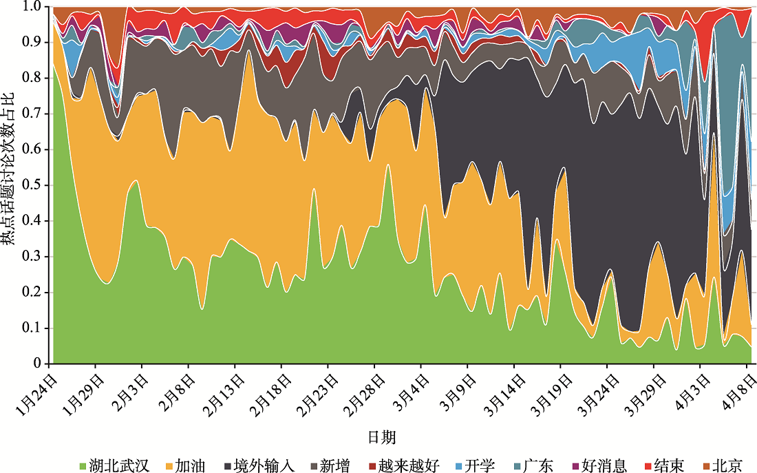 2020年初,新型冠状病毒肺炎(COVID-19)疫情席卷全国,疫情发展变化引发了社会各界的广泛关注。社交媒体平台作为网络舆情的重要载体,如何从中全面、准确挖掘分析网络舆情特征是疫情防控过程中的重要问题。本研究首先从舆情本体与客体时空关联的角度构建了疫情期间网络舆情多维分析模型,获取了2020年1月17日—3月17日多个媒体平台中新冠肺炎疫情相关的网络舆情数据;其次以疫情蔓延的视角,运用比较研究法、Spearman相关系数等方法探索了武汉市、湖北省及全国尺度下的网络舆情态势时空演变及语义特征;最后使用HowNet情感词典和情感词汇本体进行了舆情情感分析,并使用可交互信息图表对其进行可视化。结果表明:① 武汉市、湖北省、全国尺度下的每日舆情数据数量与每日新增病例数之间存在正相关关系;② 舆情数据数量的空间分布与疫情分布存在正相关关系,舆情数据数量多的地区多为疫情较为严重的地区; ③ 研究时段内不同媒体平台的舆情中立情感最多,新闻平台与论坛、微信、微博相比,整体情绪更为正面;④ 在疫情发展的不同阶段,微博热搜数据情感特征有较大差异,总体上呈现正面情绪多于负面。研究表明,基于本文提出的多维分析模型可以直观展现疫情期间多尺度下的舆情态势、舆情焦点和情绪变化,从而为政府及相关部门有效引导与控制网络舆情提供理论基础支撑和参考借鉴。
