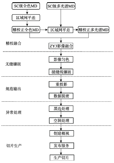 Fig. 1 Image quick processing workflow for ZY3 imagery based on ArcGIS图1 基于ArcGIS的资源三号测绘卫星影像底图快速处理流程图 |