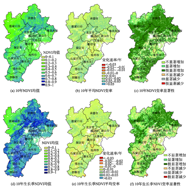 Fig. 2 NDVI, NDVI variability and its significance level in the Beijing-Tianjin-Hebei region from 2006 to 2015图2 2006-2015年京津冀地区NDVI、NDVI变率及其显著性的空间差异 |