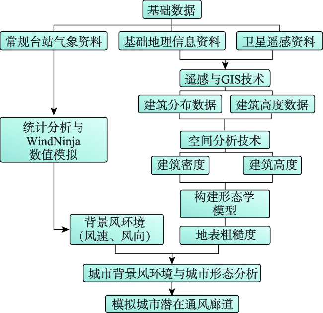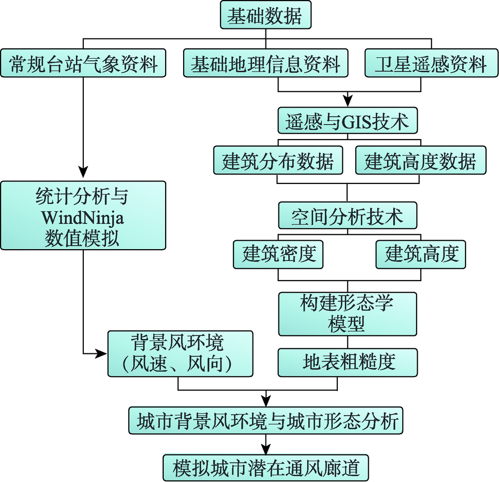 城市风环境是城市微气候研究的一个重要方向,对分析城市热岛效应、空气流通等具有重要意义。本文以郑州市市区为例,使用1971—2018年气象观测数据、2018年建筑分布数据(OSM)和2016年资源三号卫星数据作为数据源,通过运用气象学和GIS技术结合的方法,探究潜在通风廊道,科学量化城市形态对风环境的影响。研究首先借助WindNinja软件,对城市背景风环境进行模拟分析,该计算方法提高了风道定位的精度。然后利用卫星遥感数据制作了数字高程模型(DSM),结合OSM计算下垫面地表粗糙度。进一步借助ArcGIS软件,利用最小成本路径法(LCP)确定城市潜在通风廊道的位置。结果表明:① 郑州市近年来平均风速缓慢下降,平均每10年下降0.26 m/s;全年主导风向东北风进入城市后受城市形态影响在京广铁路线附近以西逐渐转为东北偏东风,其中在京广快速路以东风速较高,在京广快速路以西风速较低;② 金水区西部、中原区、二七区以及管城区的地表粗糙度较高,通风环境较差;金水区东部和惠济区的地表粗糙度较低,通风环境较好;③根据盛行风向模拟的潜在通风廊道,其共同特点是趋向于低粗糙度的地区。