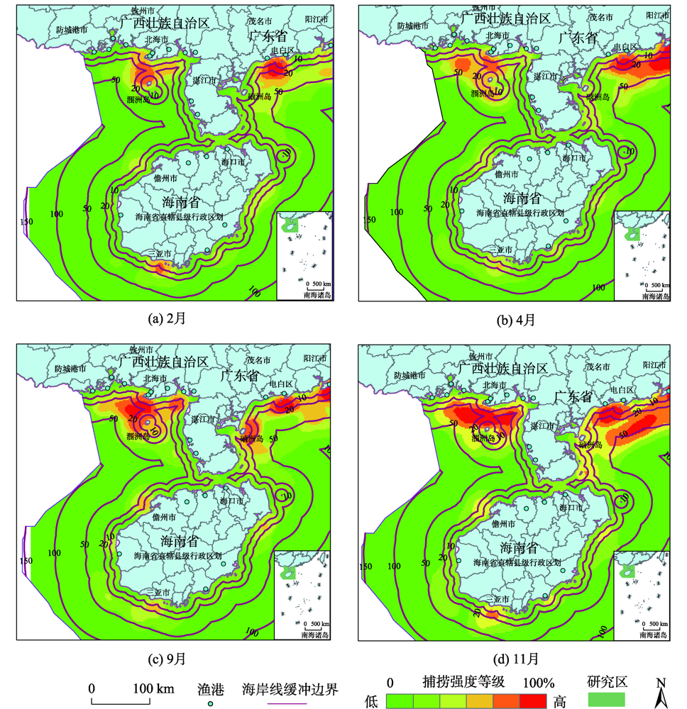 高精度渔业捕捞强度数据是开展捕捞限额管理的前提与关键,也是海洋渔业资源可持续发展的重要保障。因此,本文以挖掘海洋渔业捕捞强度空间特征为出发点,选用2018年2、4、9和11月典型季节的中国籍6364艘渔船1.8亿条高时空粒度AIS数据。运用专家知识经验、空间统计及数据挖掘分析方法,以广西南岸北部湾渔场、广东沿岸和环海南岛周边海域为研究区域,对渔业捕捞强度空间特征展开了细致的挖掘与分析。结果表明:① 广东、广西两省(以下简称“两广”)沿岸海域渔业高强度捕捞主要呈现“团块”向外扩张汇聚成“条带”或“更大团块”的特征,而环海南岛周边主要呈现“团块状”特征;② 受渔业从业人员、渔业作业船舶数量、海洋渔场及海域环境影响,“两广”沿岸近海海域捕捞强度明显高于环海南岛周边海域; ③ 高强度捕捞区域主要集中于近岸30~50 km范围内,且近海捕捞强度高于远海区域,归因于研究区内中小型作业渔船占比较高,达50.9%;④ 渔业捕捞活动受农历传统春节及休渔期等政策因素的影响,春节期间的渔业捕捞强度是所选数据覆盖时间范围中最低的,并且休渔期后(9月)渔业捕捞强度明显高于休渔期前(4月);⑤ 研究区海岸附近的大型渔港对近岸海域的高强度捕捞具有一定的辐射带动效应。本研究通过对高时空粒度的AIS数据进行处理、分析及深度挖掘,可为近岸海洋渔业捕捞强度探析提供重要数据支撑,服务于海洋渔业可持续发展。