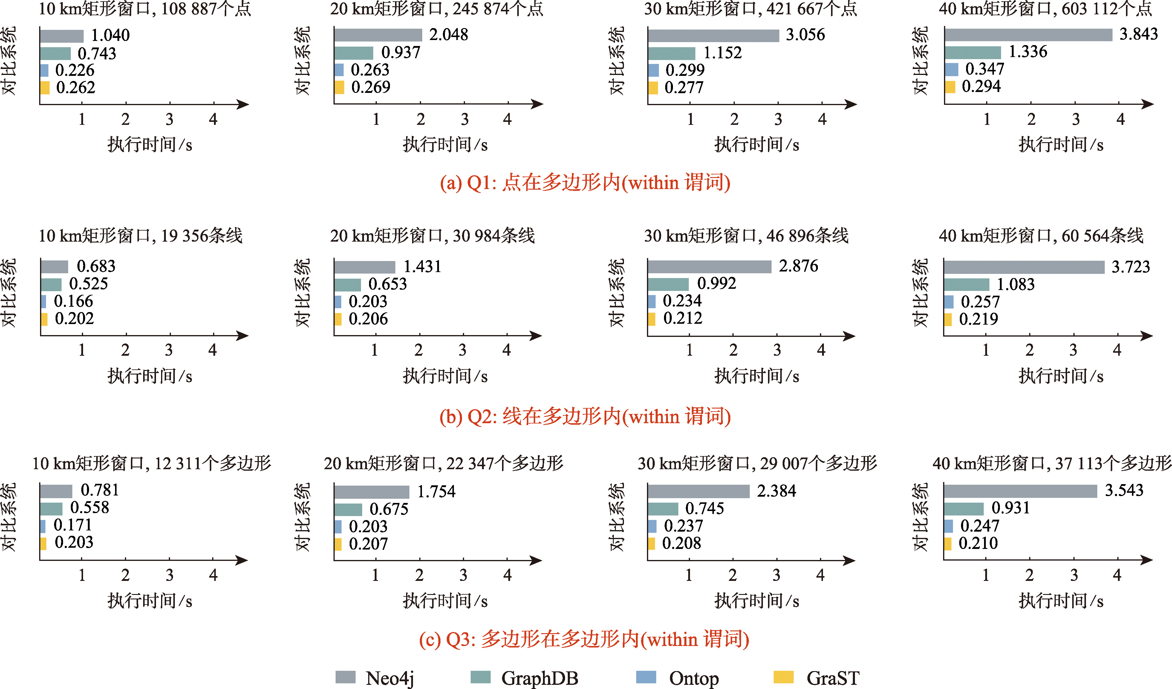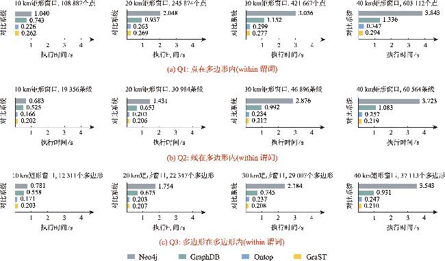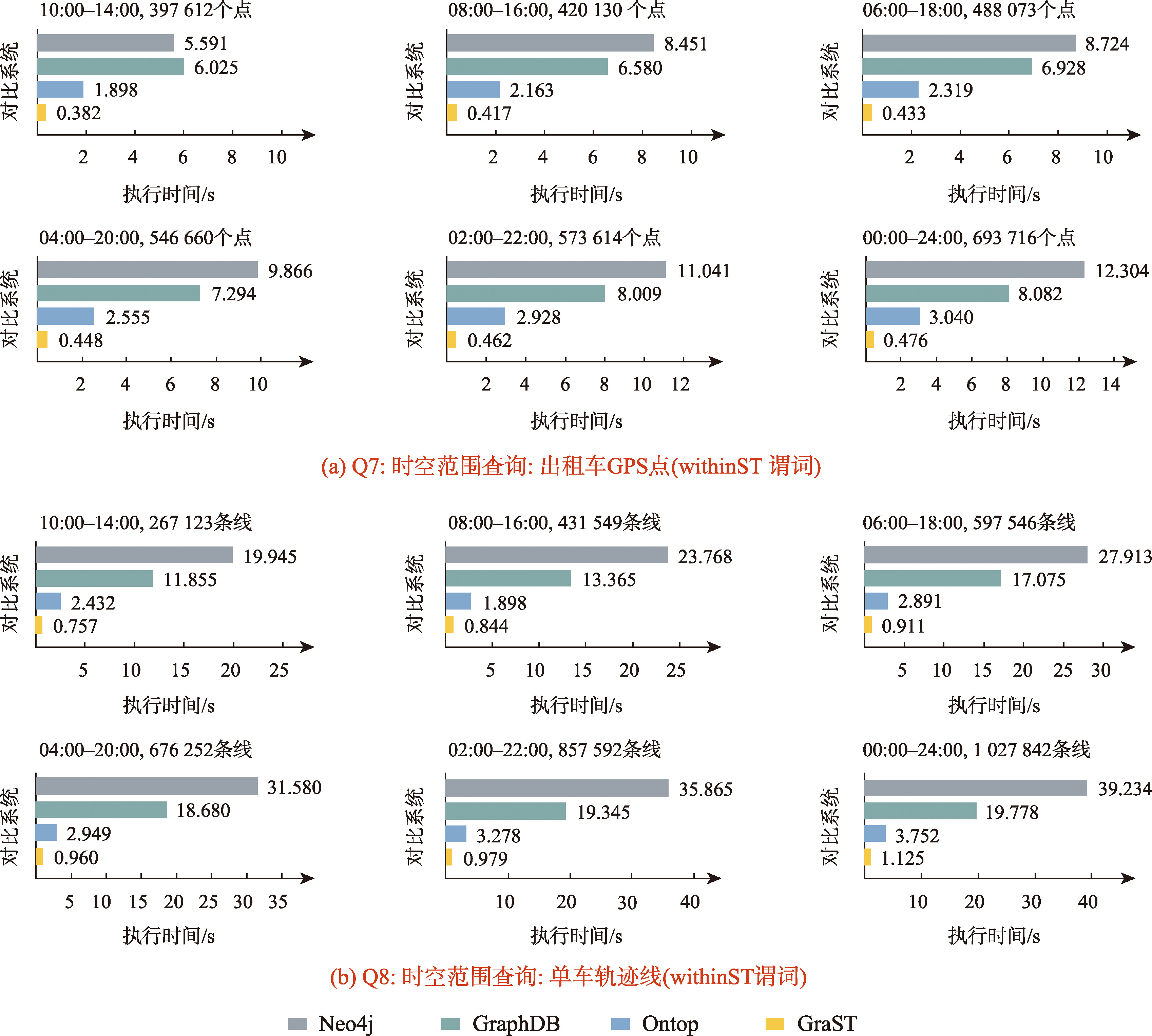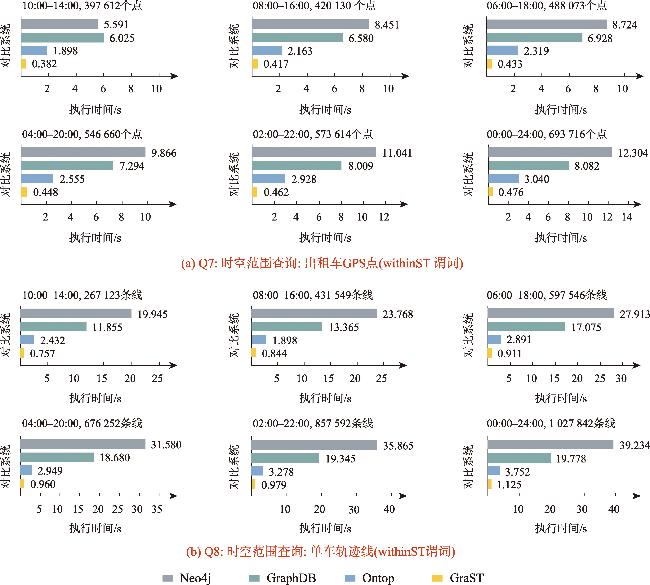 | Q7 | 时空查询(Point) | 查询位于深圳市火车站30 km矩形窗口内的出租车GPS点,其中时间窗口序列为10:00—14:00、 08:00—16:00、06:00—18:00、04:00—20:00、02:00—22:00和00:00—24:00 |