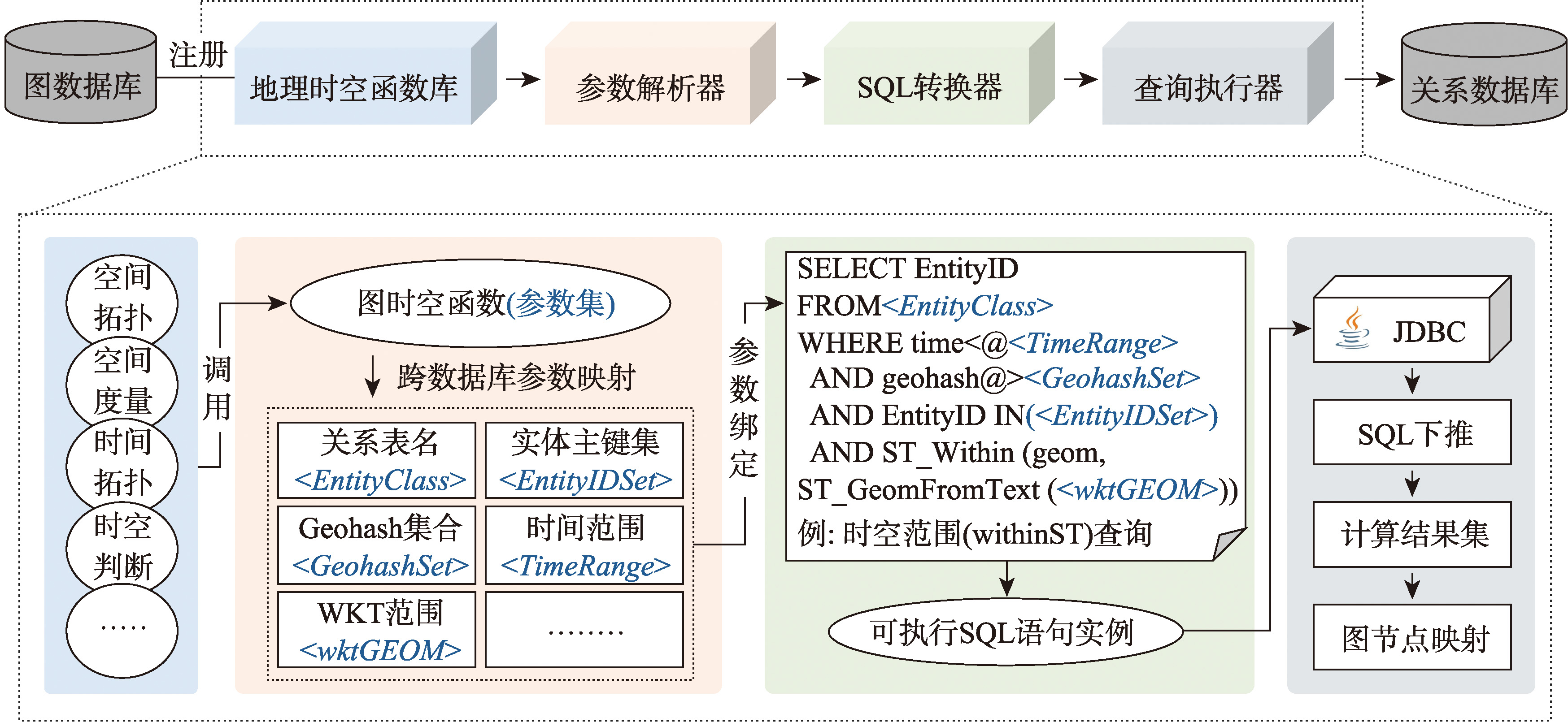 )链接,并提供外部接口供其他引擎调用。查询转换引擎负责将图数据库中预注册的时空查询函数转换为SQL语句并下推至RDBMS中执行。数据同步器引擎则基于2PC(Two-Phase Commit,两阶段提交)协议确保GDBMS与RDBMS之间的数据一致性。本节将重点讨论上述关键技术。表1 地理时空对象的属性映射表Tab. 1 Attribute mapping table for geospatial-temporal objects |