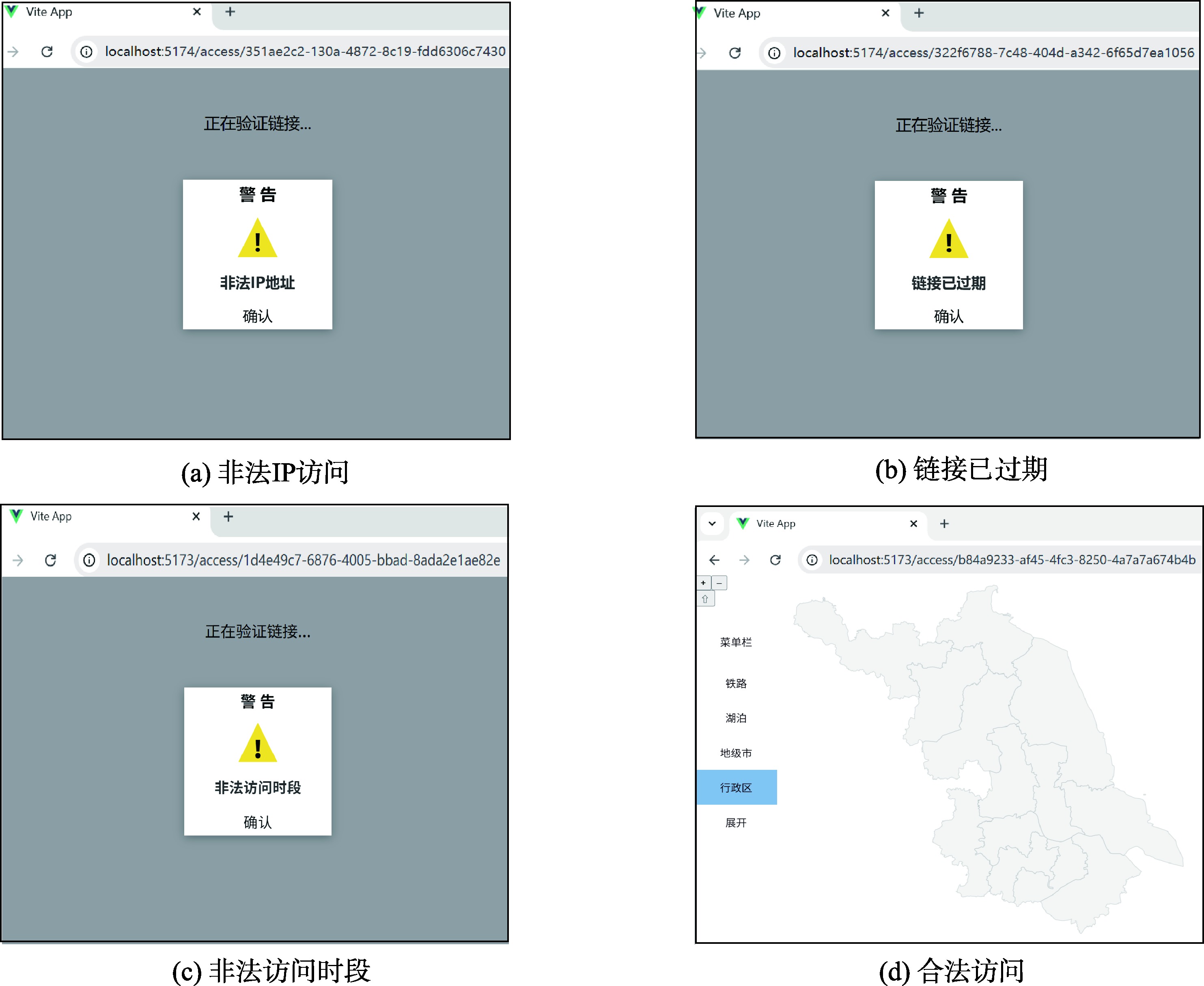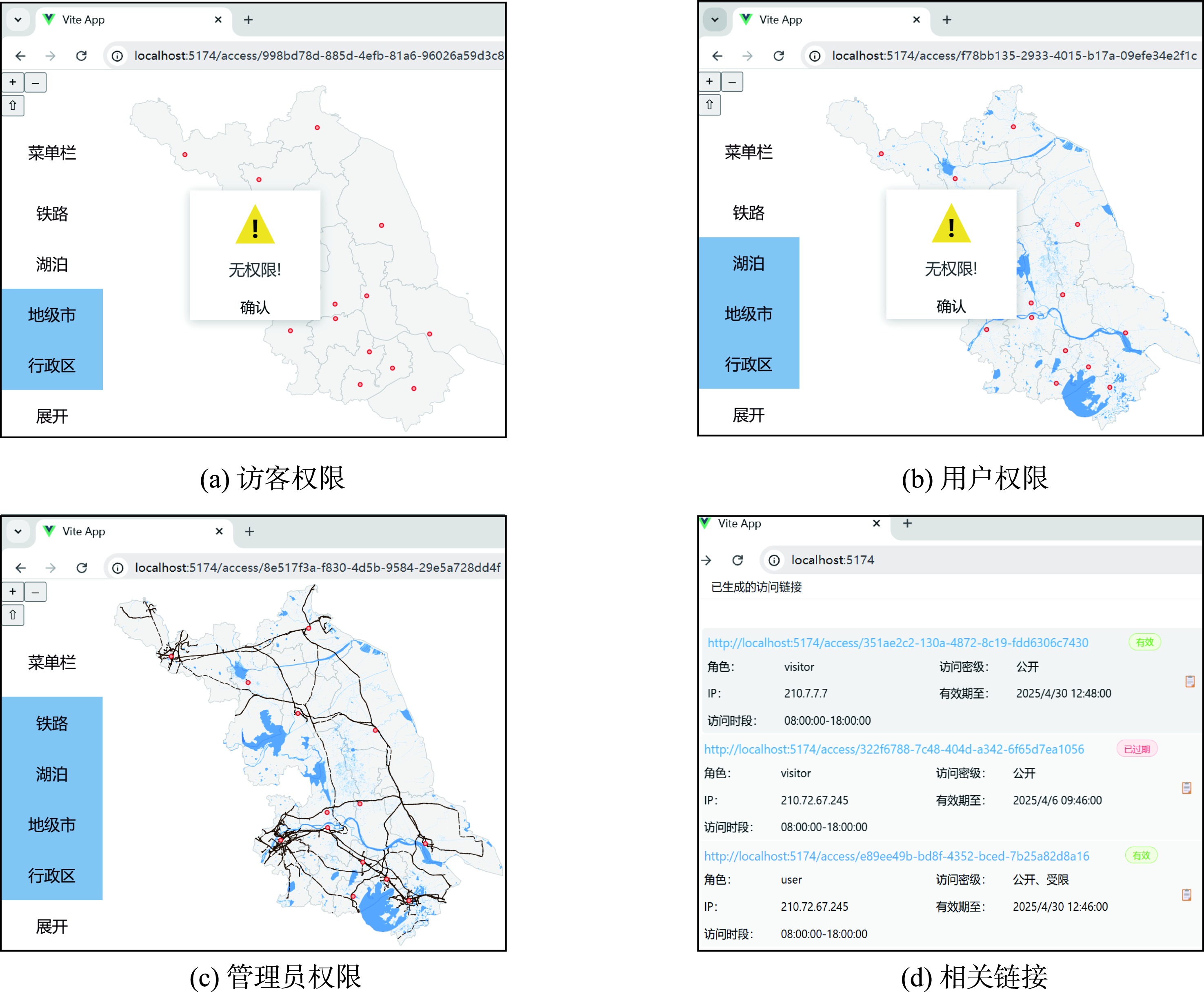 | 链接时效性约束 (图3(b)) | 访客/普通用户/ 管理员 | 过期 | 210.72.67.245 | 210.72.67.245 | 10:00 | 8:00—18:00 | 拒绝 |