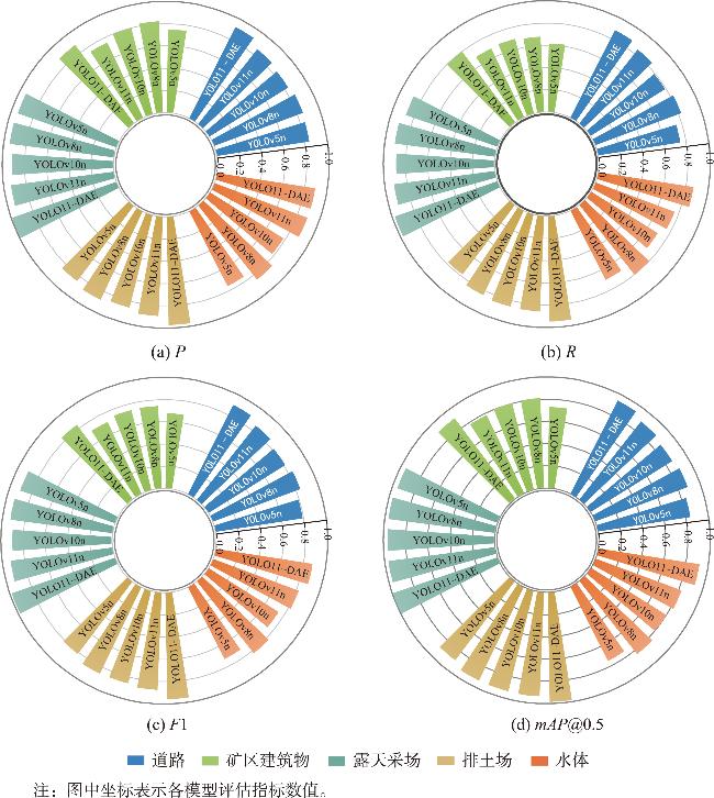 【目的】矿产资源是人类生存和经济发展的重要物质基础,开展矿山监测、建立矿山监测模型对矿产资源的高效开发和矿区环境保护具有重要意义。针对露天矿区背景复杂、目标尺度多样且小目标聚集的特点,本研究旨在构建兼顾监测精度与效率的轻量化模型,以提升矿区目标地物监测的准确性和效率。【方法】现有遥感数据集存在的样本单一、地域局限等问题,因此本文基于0.9 m天地图与1.8 m谷歌影像构建了不同气候背景、大范围和多种地物的六大露天煤矿基地OMTSFD(Open-pit Mine Typical Surface Features Dataset)数据集,提出改进的YOLO11-DAE算法进行模型训练与验证。首先,在骨干网络和特征金字塔中引入C3K2-DBB模块以增强多尺度特征捕获能力;其次,采用ADown模块替换网络下采样卷积,增强了模块对不同特征的表征能力,减少了低对比度场景的细节丢失;最后,采用E_Detect高效检测头降低模型复杂度和参数量,实现模型轻量化。【结果】实验表明,YOLO11-DAE的每秒帧数(Frames Per Second, FPS)为528.100,模型推理速度较快,精确率(Precision,P)、召回率(Recall,R)、综合评价指标(F1-Score, F1)、平均精度均值(Mean Average Precision, mAP)分别达到0.932、0.894、0.913和0.950,显著优于YOLOv5n、YOLOv8n和YOLOv10n算法,相较于YOLOv11n各项指标分别提高7.600%、10.000%、8.800%、8.000%。【结论】YOLO11-DAE算法能够满足矿区实时监测,并适用于多尺度、多背景等复杂场景的目标识别,实现了高精度、低漏检率的监测目标,达到了模型可应用性与实时性的平衡。