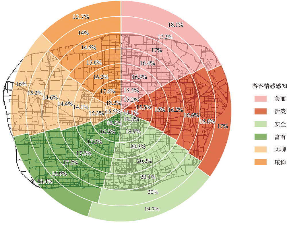 注:图中百分比表示圆环与研究区重合部分6种情感感知指标的相对比率。