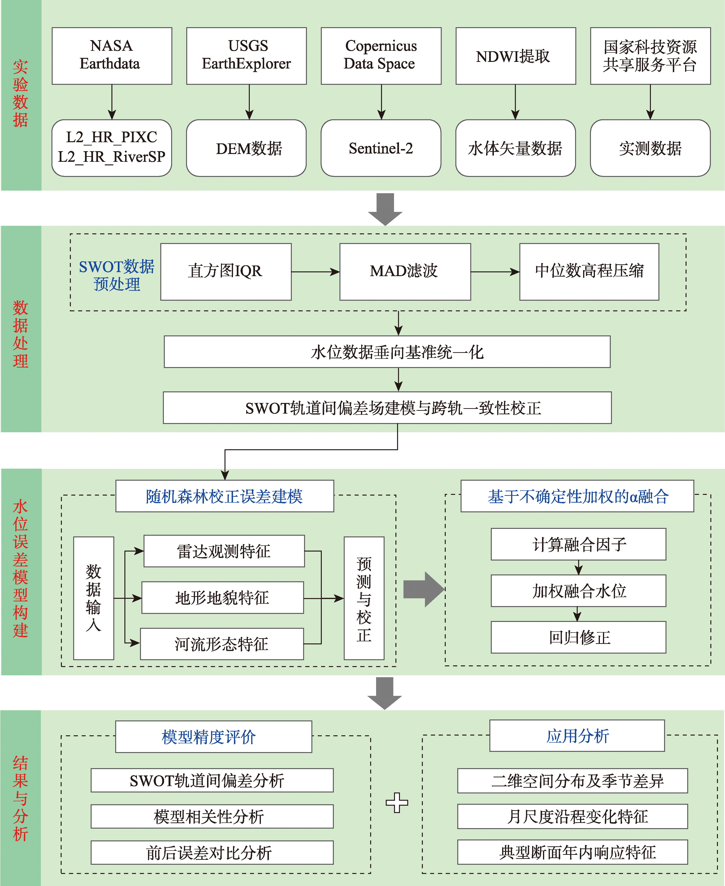 【目的】SWOT遥感测高技术为大尺度河网水位监测提供了新手段,但其原始产品受离群噪声、近岸混合像元及跨轨基准不一致等问题制约,难以满足高精度水文应用。【方法】本文面向低坡缓流与边界条件复合的长江中下游,提出基于SWOT的水位一致化建模框架,利用轨道重叠区构建偏差场完成跨轨对齐,以RiverSP节点为高精度参考,融合后向散射、地形等特征开展随机森林像元级误差回归建模;通过方差引导的α权重实现自适应融合,保持RiverSP结构稳定性与PIXC空间细节;输出统一基准、空间连续的水位场。【结果】校正结果表明PIXC与RiverSP产品的MAE由0.41 m和0.32 m降至0.15 m和0.09 m,像元产品的水位与水文站一致性R2由0.73提高至0.96。基于校正水位场构建月尺度沿程剖面与典型断面年内序列,揭示了洪峰沿程耗散与河口潮汐顶托等水位响应特征,中游年内峰谷差超过20m;入海口断面月均水位最高约5.44 m、最低约0.8~0.9 m,年内振幅约4~5 m,显示出潮汐对入海口水位的调制作用。【结论】本文提出的框架能够生成统一基准、空间连续的水位序列,可用于大尺度水文过程识别与洪水监测。