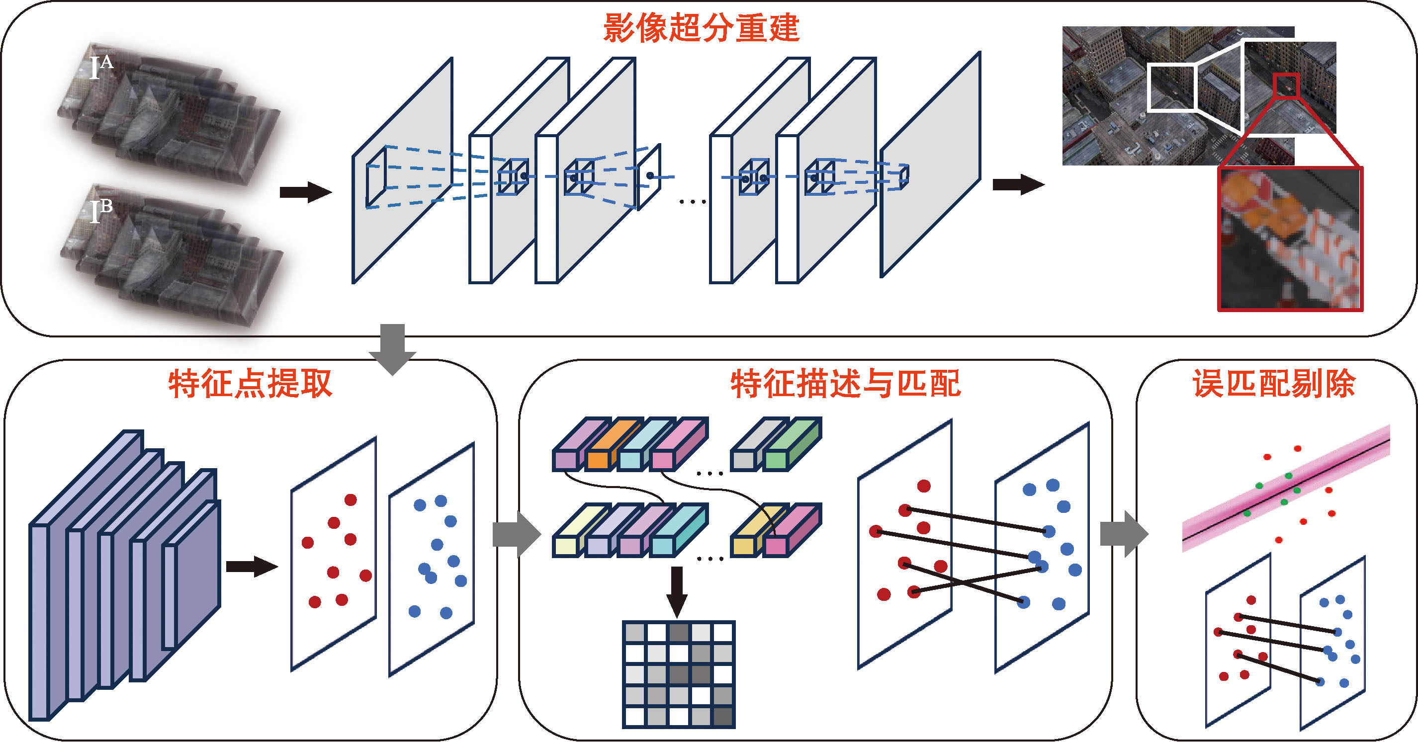 【目的】影像特征高精度提取与鲁棒匹配是摄影测量与遥感、计算机视觉等领域的核心方向。然而,当前主流的影像特征提取与匹配算法主要聚焦于提高各类复杂情况下的匹配完成度,忽略了影像特征定位精度不高、高精度匹配点数量少的问题。【方法】针对以上问题,本文提出了一种基于任意尺度超分的模块化特征匹配框架,将影像超分辨率重建模块引入传统的特征提取与匹配流程中,增强影像特征点的定位精度与可探测性,从而有效提升高精度匹配点数量与整体匹配精度。同时采用模块化设计,根据不同的匹配场景替换各模块算法,使得所提框架具有较高适用性。【结果】利用公开数据集MatrixCity和ETH3D,在不同尺度的超分辨率影像下,与当前主流的特征提取与匹配方法进行了对比实验,结果表明本文方法获取的高精度匹配点数量和特征匹配精度均有提升。其中, AKAZE算法在MatrixCity和ETH3D数据集上的匹配点数量最高分别提升了7倍和54倍,匹配点精度最高提升了58.65%,且各尺度图像超分影像匹配结果均有不同程度的提升,其中,6倍超分时正确匹配点数量最多,20倍超分时RMSE值最小。【结论】与现有主流方法相比,本文方法在匹配精度和匹配点数量方面具有显著优势,相关模块化算法能够直接用于提升现有特征提取与匹配算法的性能。