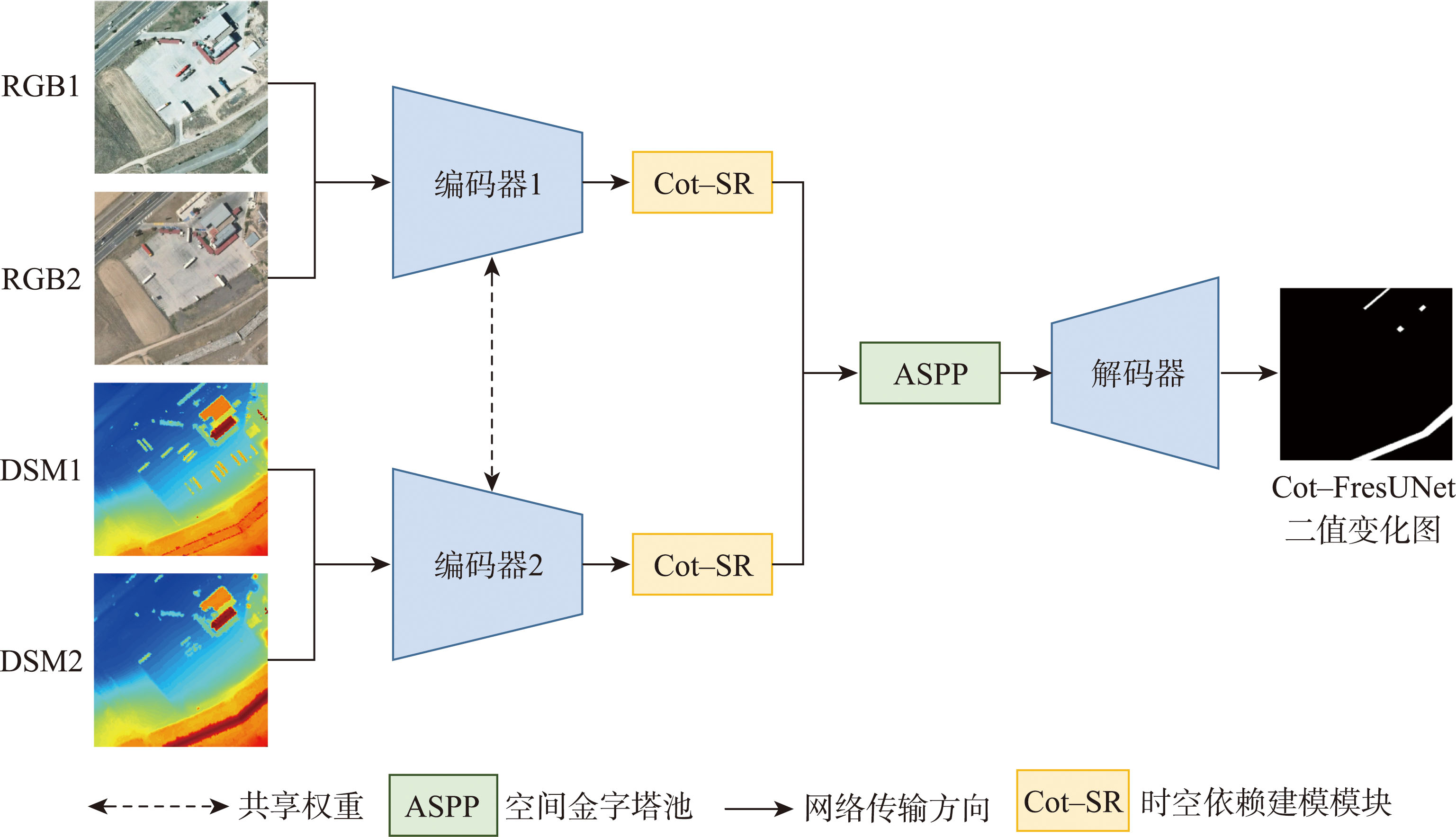 【目的】遥感变化检测技术在城市管理、环境监测和灾害应急响应等领域应用广泛,但传统基于遥感影像的变化检测技术存在诸多不足,联合遥感影像和数字表面模型(Digital Surface Model,DSM)的多模态变化检测技术有望解决以上问题,但面临数据融合方式不清晰、不同模态时空特征融合效果欠佳等问题。针对上述问题,本文提出了一种基于孪生神经网络与时空依赖模型的多模态遥感变化检测方法(Cot-FresUNet),以提升不同模态遥感数据变化检测过程中的特征融合效果。 【方法】首先,以配准后的光学影像和DSM数据作为输入,在编码阶段利用二维孪生神经网络和多尺度特征融合机制,提升模型对多模态数据共有特征的融合能力以及异同特征的辨别能力;其次,设计时空依赖模型,通过多时相特征交互,充分融合地表变化的时间连续性和空间相关性,提高模型对变化特征的表征能力;最后,在解码阶段,利用空间金字塔池化获取多尺度特征,加强局部特征和全局上下文信息的深度融合。【结果】在公开数据集3DCD上进行了8种方法的对比实验,本文方法取得的F1-score和平均交并比(Mean Intersection over Union, mIoU)分别比现有最佳方法(GSTM-SCD)提升了14.45%和15.77%。分析了模型在不同阶段的特征图和学习效果,对比了早期融合、后期融合等4种融合策略的模型性能;通过消融实验证明了融合光学影像和DSM输入能取得最高的变化检测精度。最后,对比了8类模型的复杂度指标,本方法在参数量和运算代价2个关键指标上都展现出了明显的优势。【结论】本方法能有效提升多模态变化检测精度,改善传统孪生神经网络模型存在的特征混淆、特征单一和不同时空信息交互不充分的问题。
