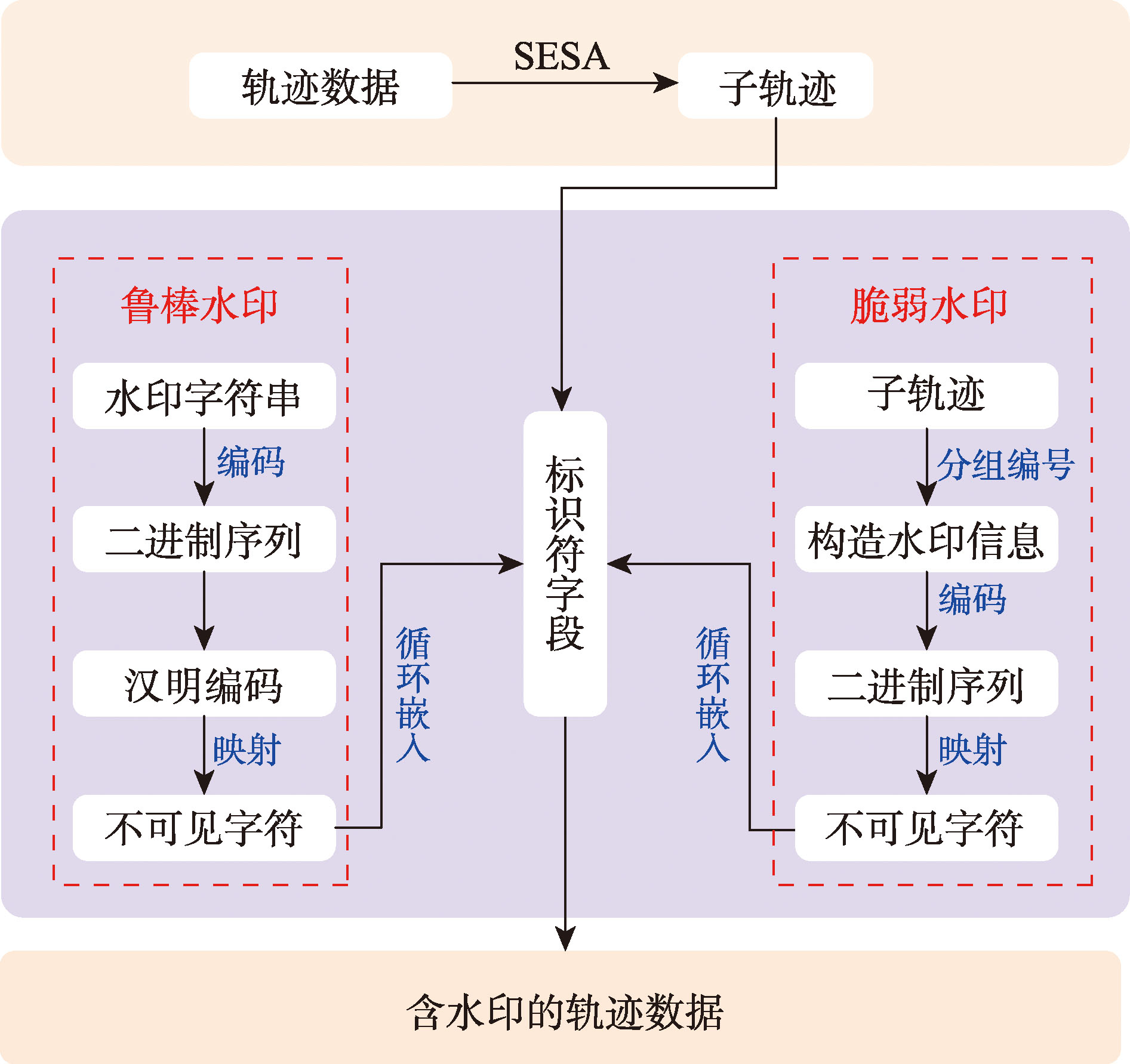 【目的】轨迹数据作为智慧交通系统中的核心时空资源,其安全性对于实现数据的可信共享至关重要。然而,现有的轨迹数据数字水印算法难以抵抗数据压缩和几何变换攻击,且在嵌入水印过程中不可避免地破坏了数据完整性,无法同时实现版权保护与完整性认证2种功能,限制了轨迹数据的共享利用。为此,本文提出一种结合鲁棒水印与脆弱水印的双水印算法,基于不可见字符实现水印信息的隐蔽嵌入,以提升轨迹数据的安全性与可用性。【方法】该算法充分利用轨迹数据的文本化表示特性,将水印信息映射为零宽度的Unicode控制字符,实现对轨迹数据的嵌入。鲁棒水印部分采用Hamming编码增强水印的自纠错能力,使其在数据传输或处理过程中仍能准确提取水印信息。编码后的鲁棒水印嵌入至数据字段末尾,确保不影响轨迹数据精度;脆弱水印则结合轨迹分组特征构建结构化水印信息,为每条轨迹记录生成唯一标识,并将其编码为不可见Unicode控制字符嵌入至特定数据字段末尾,用于完整性验证与篡改检测。【结果】在GPS轨迹数据集T-Drive与Geolife上开展的实验验证表明,所提算法在保证轨迹数据可用性与完整性的前提下,能够有效抵御包括几何变换、随机插入与删除等多种恶意操作。攻击后提取的不可见字符水印信息与原始水印间的相关系数均高于0.9,表明鲁棒水印具有良好的抗攻击性能。同时,在不同类型与不同幅度的数据篡改场景下,计算得出的篡改检测率TPR均达到1.0,能够准确识别篡改行为并定位篡改位置。【结论】本文提出的双重水印算法兼具鲁棒性和脆弱性,能够同时实现轨迹数据的版权保护与完整性验证,适用于多种智慧交通数据安全应用场景,可有效促进轨迹数据的可信共享与协同利用。