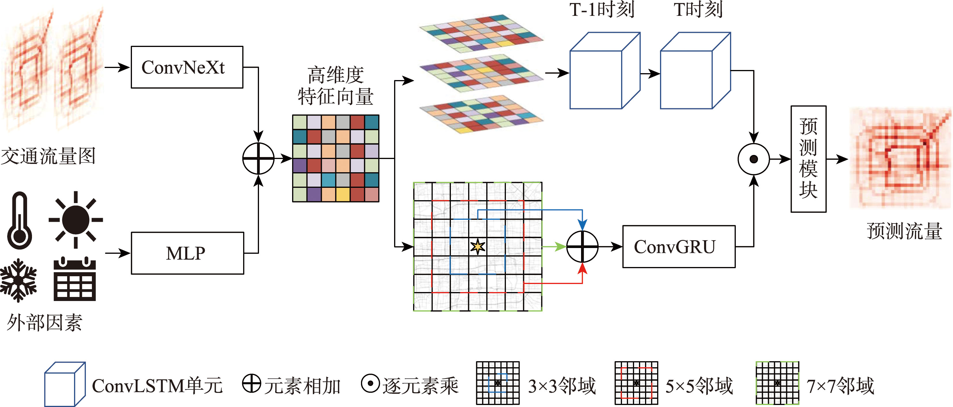 【目的】城市交通流预测是智能交通系统的核心任务,交通流在时空分布上具有复杂的跨尺度特征:既包含城市整体层面的动态演变趋势,又受局部邻域内的车流传导机制影响。现有方法难以在统一框架中准确捕捉这两类不同尺度的特征,导致在复杂交通模式下的预测精度受限。【方法】针对上述问题,本文提出了一种捕捉全局动态特征和局部传导特征的城市交通流预测模型(GDLP-Net),该模型采用双分支框架:全局动态分支利用卷积长短期记忆网络(ConvLSTM)提取城市级的时序演变规律,生成全局注意力图;局部注意力分支显式模拟不同范围邻域内的车流传导过程。在此基础上,利用全局注意力图对局部传导特征进行自适应增强,从而有效整合交通流不同尺度的时空信息。【结果】在TaxiBJ、BikeNYC和TaxiNYC 3个公开基准数据集上的实验表明,本文方法能有效降低交通流量的预测误差,预测精度全面优于现有基线模型。相较于当前表现最佳的SPN模型, GDLP-Net在BikeNYC上的平均绝对误差(MAE)和均方根误差(RMSE)分别降低约6.8%和4.6%,在TaxiBJ上分别降低约4.0%和4.1%,在具有高频波动特征的15 min细粒度TaxiNYC数据集上,模型的MAERMSE仍分别下降约2.9%和6.6%,表现出良好的泛化能力。【结论】本文方法通过捕捉全局动态特征和局部传导特征,有效平衡了模型的预测精度与可解释性,可为缓解交通拥堵、城市规划监测和辅助交通规划等应用领域提供关键技术支撑。