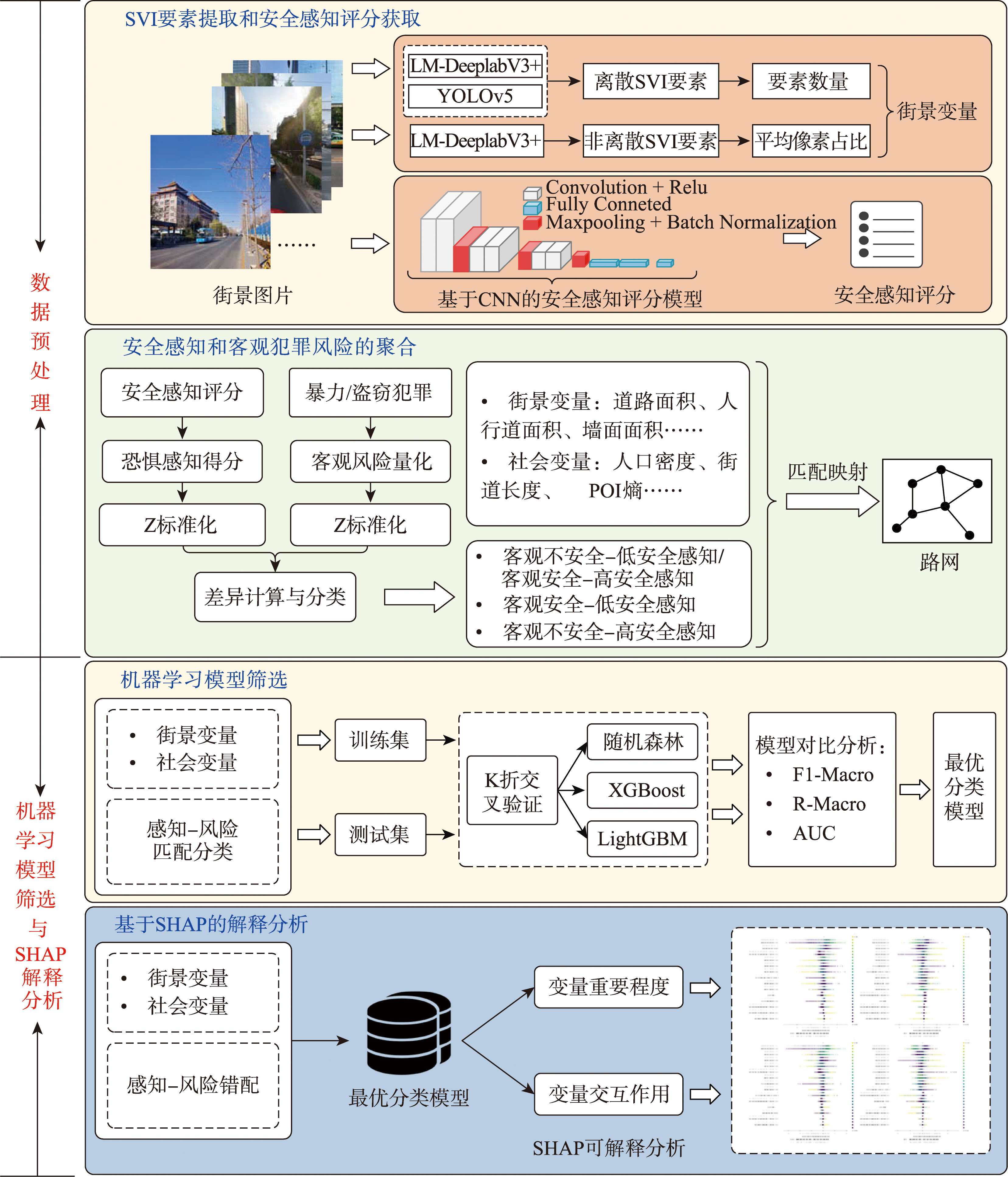 【目的】理解主观安全感与客观犯罪风险之间的错配关系,对于构建数据驱动的城市安全与宜居策略具有重要意义。已有研究虽对建成环境与犯罪风险、安全感知的关联进行了探索,但仍存在两方面局限: ① 多采用网格单元,易掩盖街道尺度的异质性与相反错配机制; ② 依赖线性方法,难以识别要素的非线性效应与交互作用。尽管近年来机器学习方法已被应用于街道尺度的犯罪预测与环境分析,但针对更精细的安全感知与犯罪风险错配关系形成机制的可解释性研究仍相对匮乏。鉴于此,本文构建了街道尺度下的可解释机器学习分析框架,以揭示建成环境要素对安全感知与犯罪风险空间耦合关系的影响机制。【方法】将基于SVI提取的建成环境特征与社会经济变量统一映射至街道单元,构建解释变量;借助基于CNN的模型获取安全感知评分,并结合街道上的犯罪密度,将安全感知与客观犯罪风险划分为3种匹配类型,作为研究因变量。在此基础上,通过多模型性能对比实验筛选出分类效果最优的XGBoost模型,并引入SHAP解释方法,从全局与局部层面量化分析不同环境要素对两类错配结果形成的影响机制。【结果】以北京市朝阳区为对象,开展街道安全感知和犯罪风险匹配的分类预测实验及可解释分析。研究表明,感知-风险错配呈现显著空间异质性:城市核心区的客观不安全街道多表现为“高安全感知”错配,边缘区的客观安全街道则呈现“低安全感知”错配。在“客观不安全-高安全感知”街道中,建筑物面积对盗窃与暴力犯罪的影响最大(SHAP值分别为0.636、0.781),其次为街道长度(0.337)与道路面积(0.320)等要素,且各变量间存在非线性增强与条件调节效应。【结论】本文通过融合可解释机器学习与街道尺度分析,揭示了建成环境要素影响安全感知偏差的非线性机制,为精细化城市安全治理与空间设计干预提供了方法支撑与实证依据。