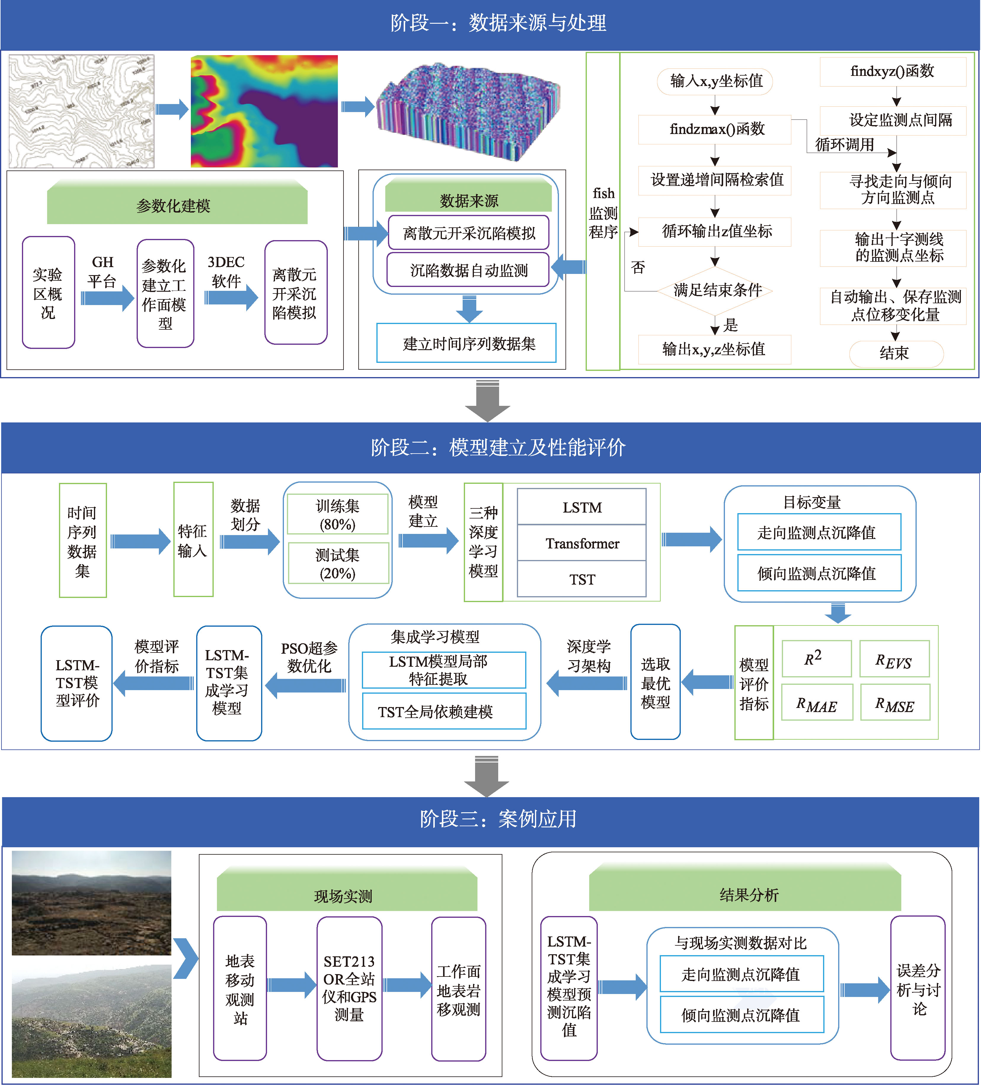 【目的】采动沉陷严重制约矿井安全生产并危及地表构筑物稳定。地表沉陷预测精度受矿井地质条件与开采技术参数的影响,理论模型的适用性与实测技术的工程效能受限,难以满足高效、精准的沉陷监测与预警需求。【方法】综合利用离散元模拟样本强扩展性与深度学习数据驱动的优势,提出一种基于离散元模拟数据驱动的集成学习时间序列预测方法,实现对开采沉陷的准确预测。以冯家塔煤矿1 208工作面作为工程背景,分别利用Rhino-Grasshopper与3DEC程序自主开发参数化建模与自动化监测程序,实现高精度离散元参数化建模、开采沉陷模拟与沉降值的自动监测,结合现场实测、分析得出的矿压显现规律完成模型参数校核,构建地表沉陷时间序列数据集。基于LSTM、Transformer和改进的时序Transformer(TST)共3种深度学习算法分别构建采动作用下地表沉陷时间序列预测模型,依据回归类模型评价指标开展了最优模型的评选,进而将LSTM作为前置时序特征提取器与最优模型集成,构建一种集成学习开采沉陷预测模型。【结果】研究表明:TST模型在沉陷预测中表现最佳(倾向测点:R2 =0.969、REVS =0.973、RMAE =0.022、RMSE =0.001;走向测点:R2 =0.965、REVS =0.968、RMAE =0.026、RMSE =0.002),结合LSTM模型优化后预测性能得到了进一步提升(倾向测点:R2REVS分别提升了2.06%、1.64%;走向测点:R2REVS分别提升了1.66%、1.45%),由此可知TST架构融合LSTM算法后,能够有效提升模型对时序数据中短期动态变化的敏感性与捕捉能力; LSTM-TST模型分别与相邻1209工作面以及榆家梁煤矿52309工作面现场实测数据对比,1209工作面走向与倾向方向的最大沉降误差分别为69.2 mm和47.0 mm, 52309工作面走向与倾向方向的最大沉降误差分别为81.2 mm和74.5 mm,表明该模型具有较高的预测精度与良好的泛化能力。【结论】研究融合了地表沉陷时序数据的自动监测、数据集构建与集成学习技术,提出了一种开采沉陷智能预测方法。