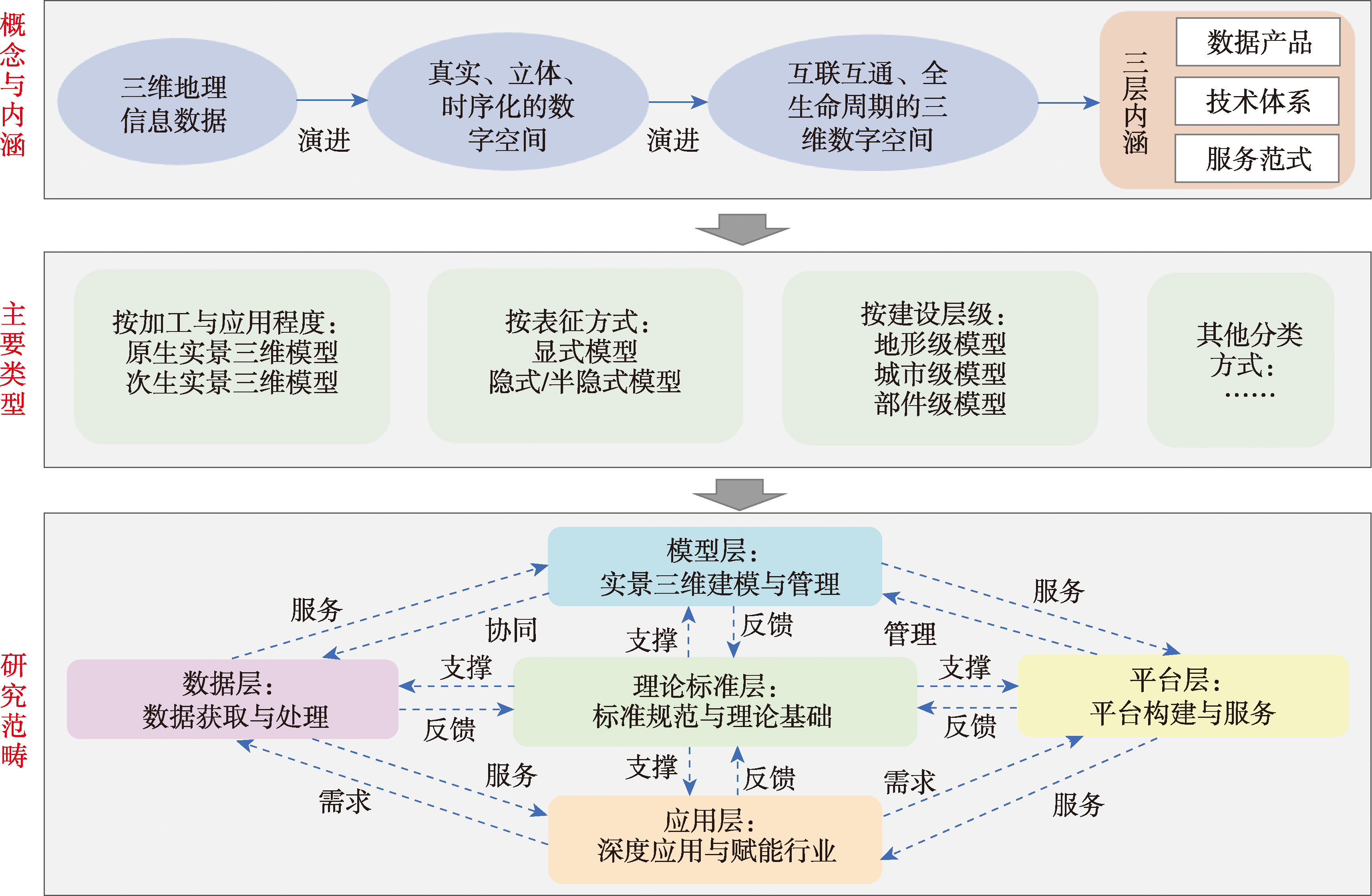 【意义】实景三维模型正从过去的“表达现实”发展演变为现今的“连接现实、认知现实乃至预见现实”。随着实景三维中国建设的全面推进,“实景三维+”的融合应用模式已渗透至诸多行业。作为国家重要的新型基础设施,实景三维模型对于地理空间认知、虚拟地理环境、时空计算等科学研究,以及对于数字中国建设、数字经济发展、精细化社会治理等国家战略和社会需求,具有重要价值。【分析】本文系统综述了实景三维模型的概念框架、核心方法、应用场景和面临的挑战。首先,对实景三维模型的概念、内涵和主要类型进行了系统回顾和归纳总结,提出原生实景三维模型和次生实景三维模型的概念,以推动其深度应用;并从数据层、模型层、平台层、应用层、理论与标准规范层5个层次对实景三维模型的研究范畴进行归纳。其次,按照“原生实景建模-次生实景建模-模型优化与评估”的思路,梳理了当前实景三维建模的核心方法,并探讨各类方法的发展方向。接着,系统回顾了实景三维模型的应用场景,并从“时空底座-信息提取-连通现实-赋能行业” 4个维度,总结其行业服务和应用范式。最后,从地理信息认知范式转型、复杂场景时空动态建模、智能化转型和行业深度应用等方面,总结了当前实景三维建设面临的主要问题和挑战,并对实景三维模型的未来发展方向进行了展望。【目的】本文旨在为相关研究提供全局性的学术视野与系统的技术发展脉络,帮助相关研究人员与技术人员快速把握实景三维领域的前沿态势,为技术研发与“实景三维+”的行业应用提供参考依据,并对人工智能赋能实景三维建设等潜在突破方向进行预判,启发创新性研究和实践思路。