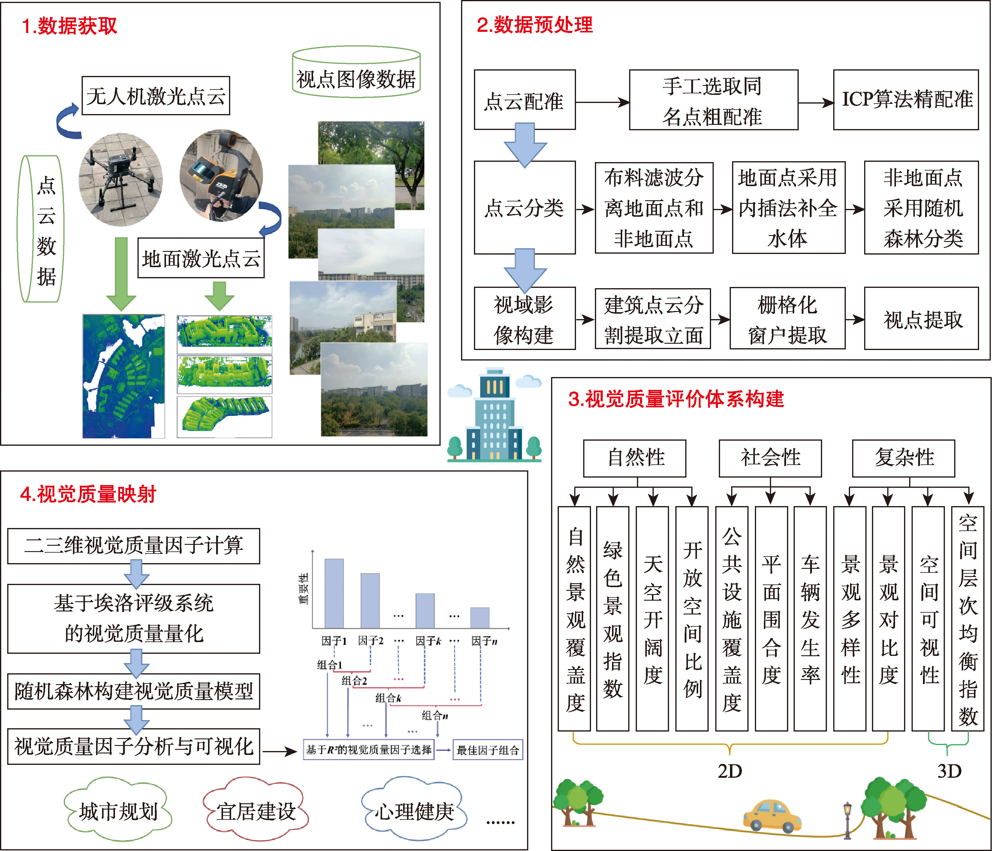 【目的】视觉质量是衡量城市建成环境的重要感知指标,对城市更新和人居环境改善具有重要意义。现有方法缺少建成环境对室内空间视觉质量影响的评估,难以准确反映城市空间中人居体验的真实感受。【方法】本文融合多源激光点云,提出一种基于窗域视角的视觉质量评价方法。首先,配准无人机与地基激光点云并提取地物类别,以窗户中心为视点构建视域影像,采用类别和视距分别赋值;其次,提出空间可视性和空间层次均衡指数2种三维评价因子,并结合9种现有二维评价因子基于视域影像构建自然性、社会性和复杂性视觉质量评价体系;最后,引入埃洛评级系统对视点处公众的主观感知进行量化,利用随机森林构建评价因子与视觉质量评分之间的关联,并分析因子相关性。【结果】结果表明,在所选实验区域,本文方法评价精度较高, R2可达0.969 3。空间可视性、天空开阔度和空间层次均衡指数应作为提高城市视觉质量的优先考虑因素。二维指标在视觉质量评价中占主要地位,但三维指标在有限因子情况下预测能力更强、影响更大。大多数评价因子与视觉质量得分呈正相关。视域范围开阔、地物类别数量丰富的区域,视觉质量等级更高。【结论】本文依托窗域视角,创新性地提出空间可视性和空间层次均衡指数,并引入埃洛评级提高评价结果的客观性,实现视觉质量的多维度、多元评价。本文方法能定量评估室外建成环境对室内空间视觉质量的影响,从视觉感知角度支撑精细尺度和重点区域的城市评价,为城市规划、景观设计提供量化数据支撑。