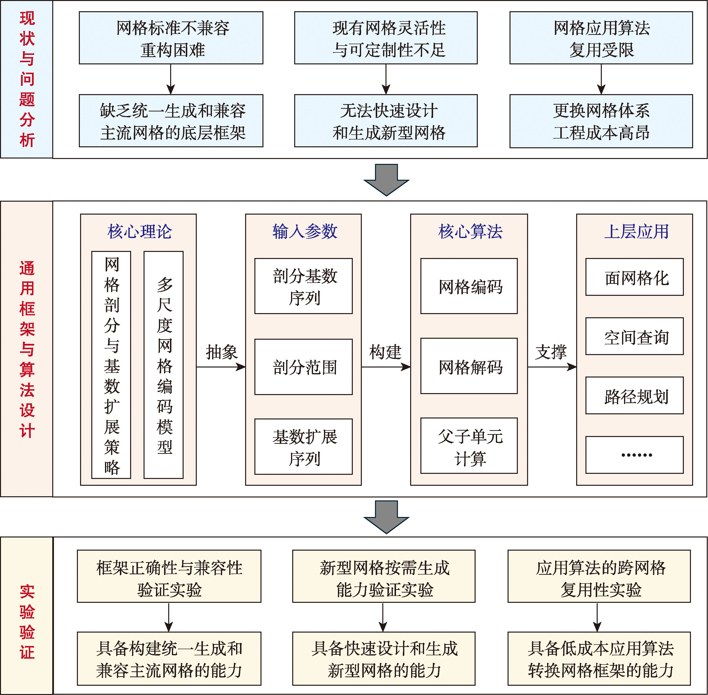【目的】现有的四边形全球离散网格系统(Discrete Global Grid System, DGGS)多采用固定的剖分规则,网格系统数量众多却相互独立,这导致了标准多样、剖分规则固定以及算法复用性差等问题,制约了上层应用算法的跨网格复用。【方法】为突破上述瓶颈,本文提出了一种基于可配置剖分基数序列的多尺度通用四边形全球离散网格生成方法,将网格生成逻辑与具体剖分结构进行解耦。首先,将网格剖分规则抽象为剖分基数序列作为可配置的外部参数,实现了网格生成逻辑与具体物理结构的分离;其次,设计了一种基数扩展策略,通过建立虚拟进制映射机制,解决了GeoSOT等复杂网格中非标准整数倍剖分的兼容性难题;最后,构建了统一的逻辑索引空间,确保不同层级采用异构剖分策略时,其内部逻辑结构、编码运算与拓扑关系仍遵循统一的算法流程。【结果】基于全球模拟离散坐标点数据和真实区域多边形数据,开展了网格兼容性、按需生成能力及算法复用性实验。实验结果表明:在网格兼容性方面,本文方法能够生成与现有主流网格结构(GeoSOT、GMGICM)数量一致的剖分结果,其编解码耗时与现有主流网格方法相当,验证了对既有网格框架的良好兼容性;在灵活性方面,本文方法仅通过调整外部参数即可构建全3分、全5分、235分循环等多种新型网格体系,验证了本文方法按需生成网格的能力;在算法复用性方面,本文算法通过一套统一的应用代码即可支持7种异构网格体系下的多尺度矢量面网格化应用,避免了传统方法中代码量随网格类型线性增长的问题,验证了其在异构网格间低成本迁移与复用的能力。