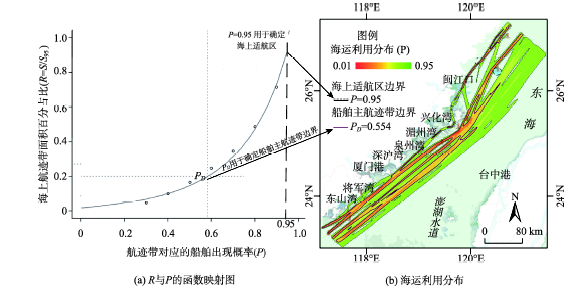 Fig. 4 SUD and PFR in Taiwan Strait: (a) northbound/southbound voyages and (b) direct cross-strait transits图4 海峡南北干线和两岸直航航次的海运利用分布、主航迹带边界示意图 |