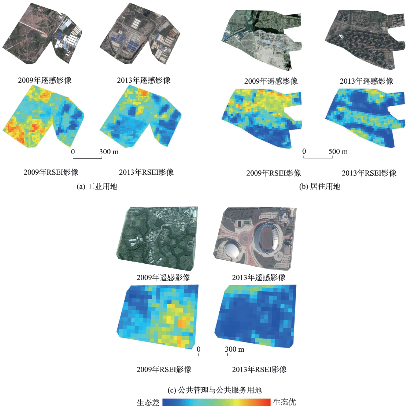 Fig. 3 Remote sensing images of the representative plots and their corresponding RSEI images before and after the construction图3 代表性地块建设前后的遥感影像及所对应的遥感生态指数(RSEI)影像 |
