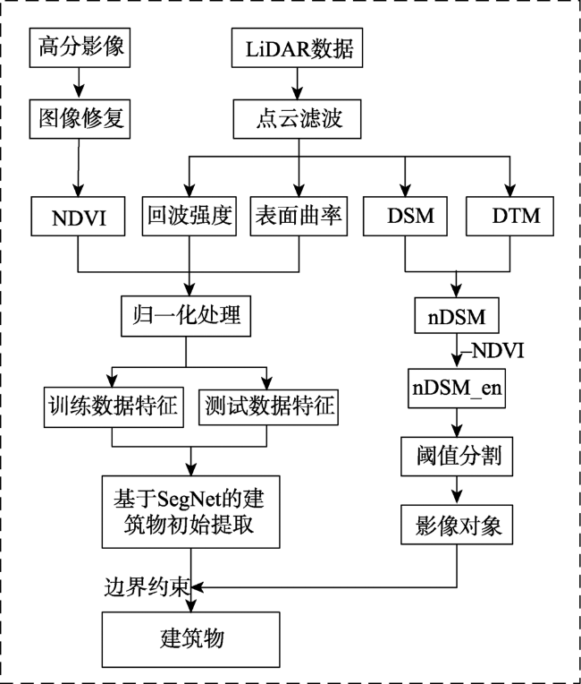 One of the main feature types in urban areas is building; automatic building extraction from high-resolution imagery or other data has great significance for improving the quality and efficiency of land use change detection, urban planning, land law enforcement, and so on. To deal with the problem of boundary inaccuracy of extracted buildings and the limitation caused by expressing image information with artificial features, this paper proposed a new building extraction method based on the SegNet semantic model, which fused feature information from LiDAR data and high-resolution imagery. Firstly, LiDAR data were preprocessed to obtain Digital Surface Model (DSM), Digital Terrain Model (DTM), and normalized Digital Surface Model (nDSM). The resulted image nDSM_en was acquired by removing tree points from nDSM with Normalized Differential Vegetation Index (NDVI) values derived from high-resolution imagery. Secondly, three features–LiDAR data echo intensity, and surface curvature from LiDAR data, and NDVI from high-resolution imagery were obtained to construct feature images for training the SegNet semantic model. Initial extraction of buildings was completed with the trained model. Finally, the threshold segmentation algorithm was executed with nDSM_en for generating image objects, which were used to refine the initially extracted buildings through boundary constraints. In the experiment which utilized the Standard Dataset as a sample, the average completeness, correctness, and extract quality of the proposed method at the pixel level were 96.4%, 94.8%, and 91.7% respectively. For building objects with area larger than 50 m 2, the above three indicators were 100%. Our findings suggest that the proposed building extraction method makes better use of the feature information which reflects the essential difference between buildings and non-buildings, integrates effectively the relative advantages of the two data sources, and can increase the accuracy of building detection and extraction.Key words: building extraction; LiDAR data; high resolution image; SegNet; threshold segmentation; boundary constraint