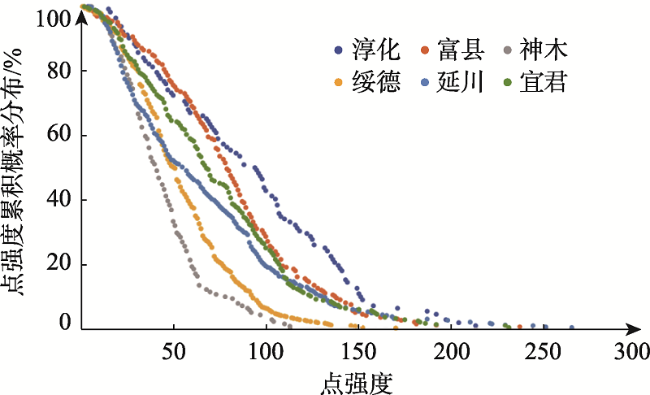 图4 黄土高原各样区点强度累积概率分布Fig. 4 Cumulative probability distribution of point strength in plots of the Loess Plateau |