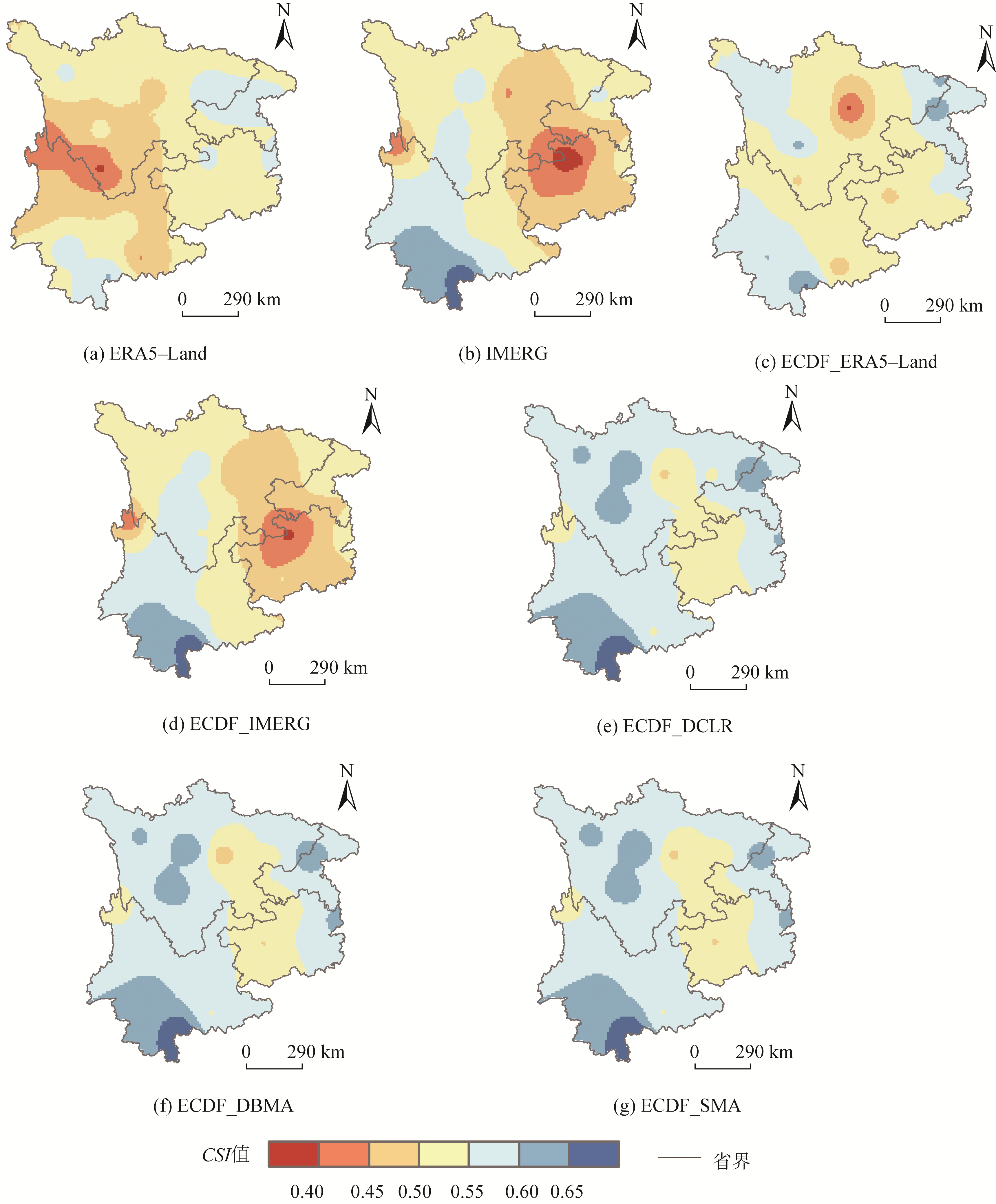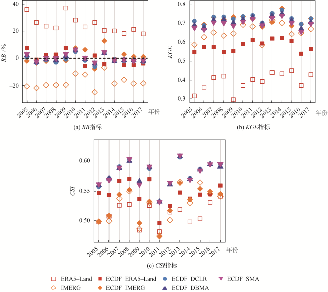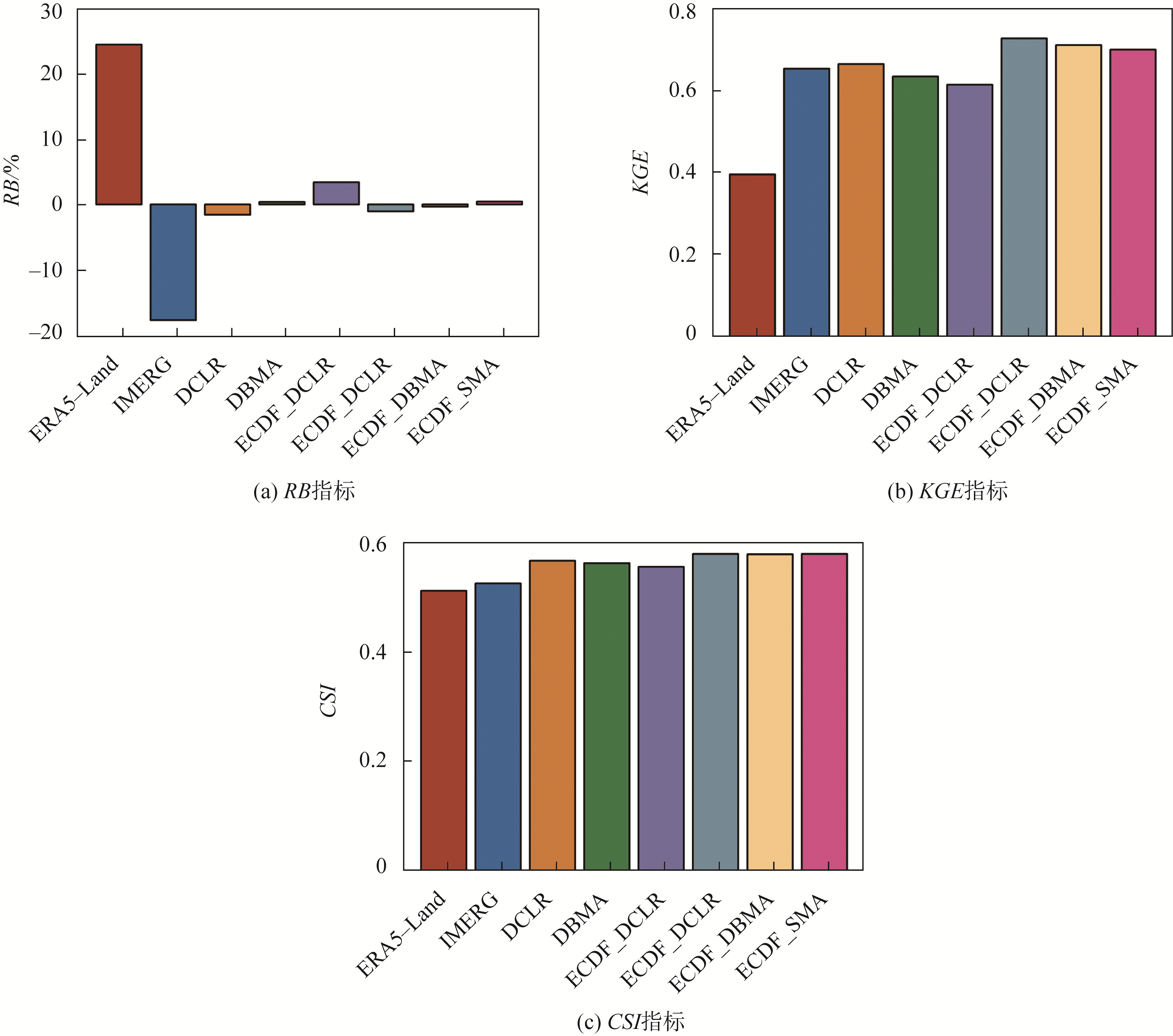 | 产品 | RMSE/(mm/d) | RB/% | CC | KGE | POD | FAR | CSI |