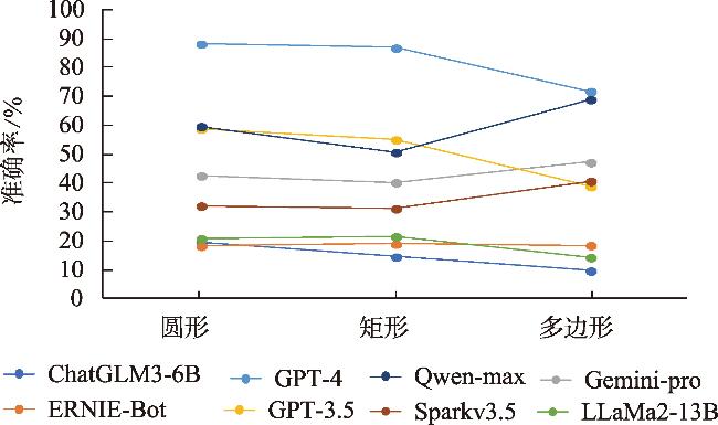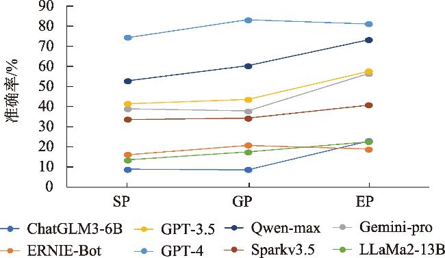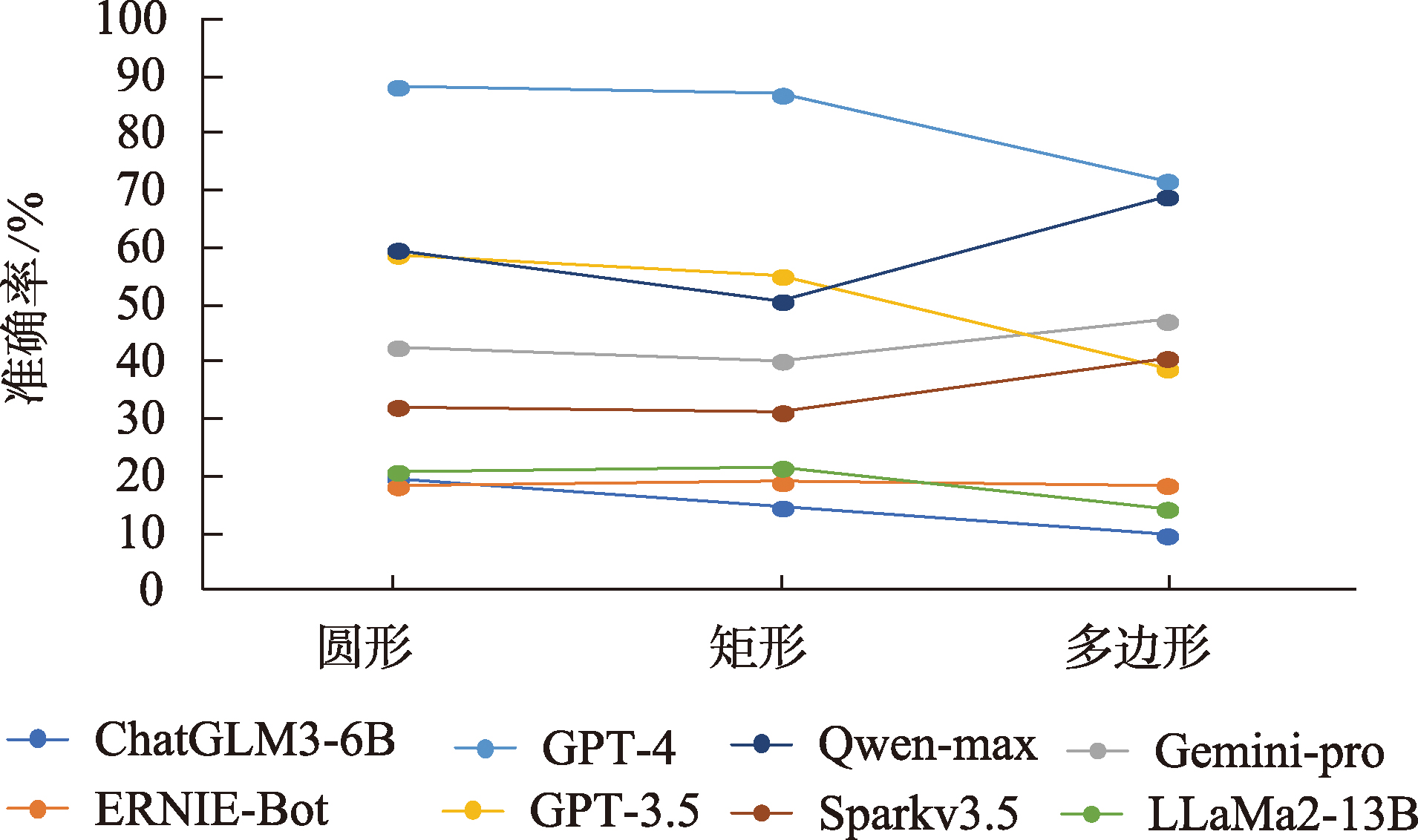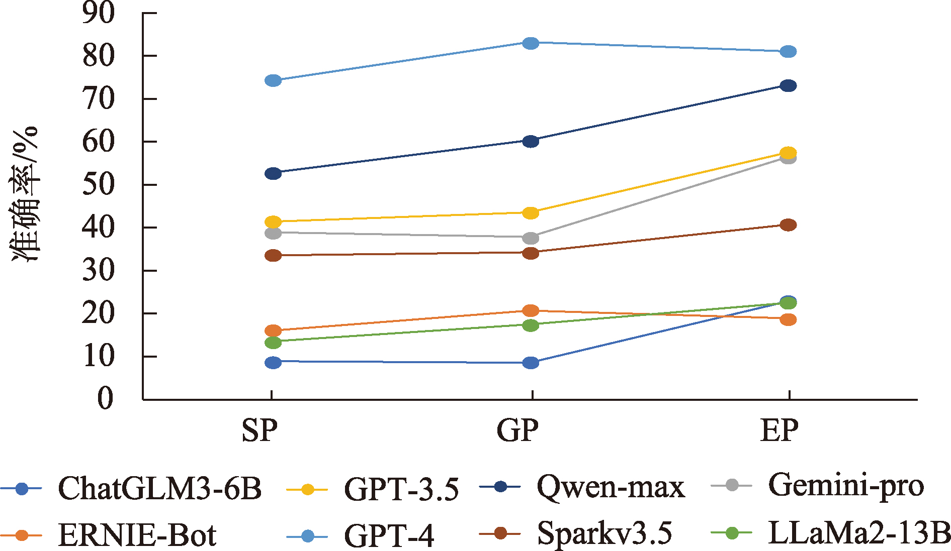 | 表4 Simple Prompt (SP)、Guiding Prompt (GP)和Example Prompt (EP)策略下的大模型空间认知准确率Tab. 4 Spatial cognitive accuracy of large language models using Simple Prompt (SP), Guiding Prompt (GP), and Example Prompt (EP) (%) |