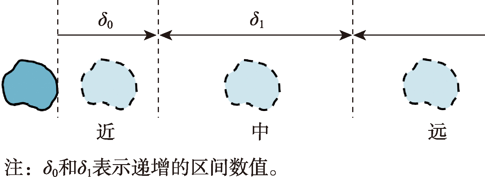 | 距离关系 | Qualitatively describe the relation by delimiting the distance range. (1) Close(x, y): The length of the distance from x to y is [0, δ0]. (2) Medium(x, y): The length of the distance from x to y is (δ0, δ0+δ1]. (3) Far(x, y): The length of the distance from x to y is (δ0+δ1, +∞). |
