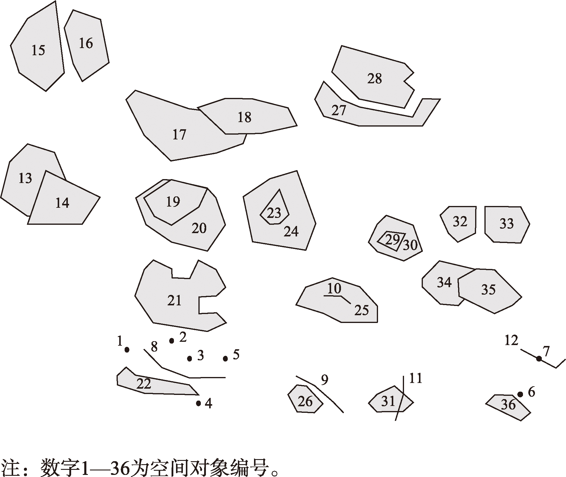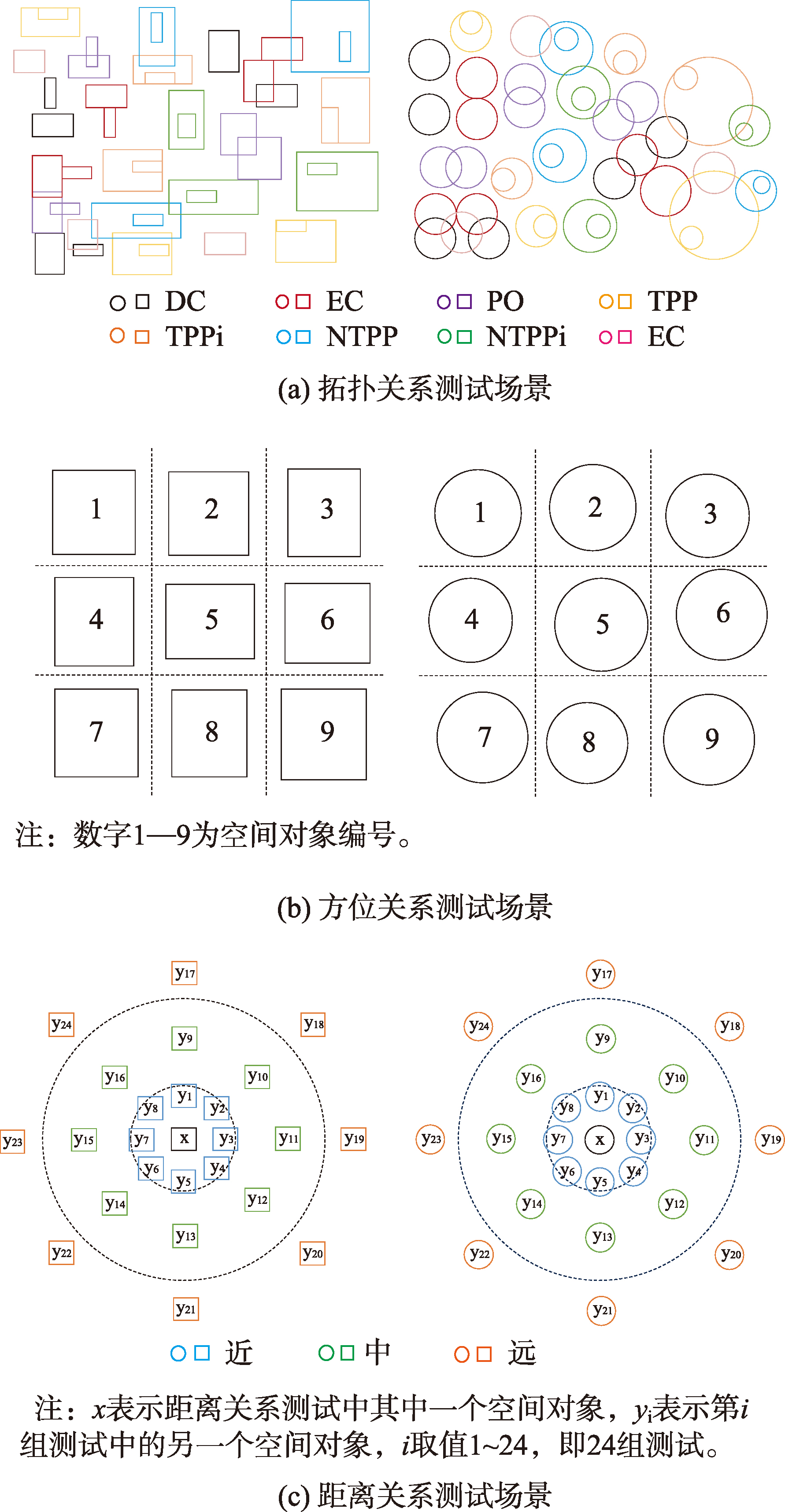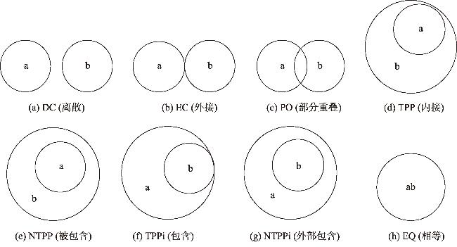 | 拓扑关系 | (1) DC(x, y): x is disconnected from y. (2) EC(x, y): x is externally connected to y without any overlap. (3) PO(x, y): x partially overlaps y, with neither being a part of the other. (4) TPP(x, y): x is a tangential proper part of y. (5) NTPP(x, y): x is a nontangential proper part of y. (6) TPPi(x, y): y is a tangential proper part of x. (7) NTPPi(x, y): y is a nontangential proper part of x. (8) EQ(x, y): x is identical with y. |