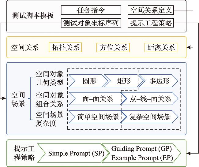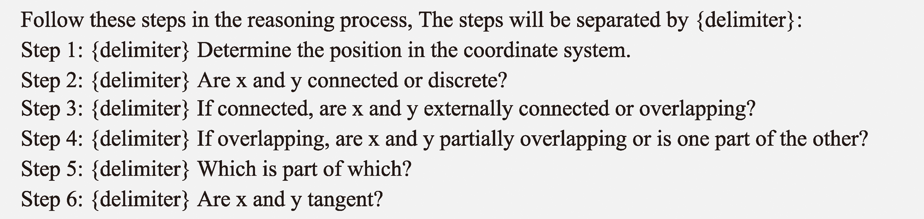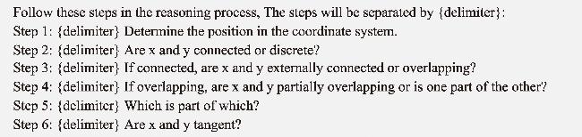 | 输入:空间对象形状shape; 空间对象坐标coordinate; 空间关系 定义relation 输出:Example Prompt模板 1. 初始化Example Prompt模板: Your task is to determine the topological relation between two closed geometrical shapes in the same coordinate system. The eight kinds of topological relations will be delimited with ``` tag. ```{relation}```. You will be given two cases to learn how to reason the question out. Case 1 - The two geometrical shapes are {shape} that will be given their position by coordinates: rectangle x: (5, 6), (7, 6), (7, 7), (5, 7), (5, 6); rectangle y: (4, 5), (8, 5), (8, 8), (4, 8), (4,5). Answer 1 - Based on the given coordinate information, the position of the two circles in the coordinate system can be determined: rectangle x: x-coordinate ranges from 5 to 7, y-coordinate ranges from 6 to 7. rectangle y: x-coordinate ranges from 4 to 8, y-coordinate ranges from 5 to 8. |