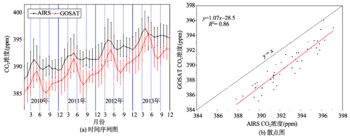 2010-2013年全球平均AIRS与GOSAT CO2月平均浓度的时间序列及散点图见图1,月平均数据为全球范围内数据的平均值。由图1可知,虽然二者调整后的相关系数高达0.9以上,但是,AIRS反演得到的对流层中层CO2全球月平均浓度,始终高于GOSAT近地面CO2浓度。这可能是由于GOSAT探测到CO2近地面“汇”特征导致浓度值偏低,而在大气高层,地表特征因传输过程而被削弱,CO2充分混合,因此,被AIRS探测到的CO2浓度相对较高。二者的CO2浓度高值均出现在春季,低值出现在夏末,这与植被的生长规律密切相关。在春季,植被开始快速生长,呼吸作用增强,因而释放出大量的CO2,再加上冬季供暖导致CO2积累[11];在夏季,植被光合作用增强,吸收了大量的CO2,浓度降低。然而,由于这2种传感器所探测的CO2敏感高度不同,且对流层中层与底层CO2的垂直输送混合需一段时间,因此时间序列上存在着滞后差异[22-23]。时间序列图中误差棒为二者CO2在全球区域内的标准偏差,即其空间差异性,其中AIRS反演结果的空间差异性在春季相对较大,其他季节与GOSAT相差不大。这是因为GOSAT三级CO2产品是由二级产品经过多次克里金插值或线形插值得到,采用临近像元数据进行插值使得其空间差异性变小。