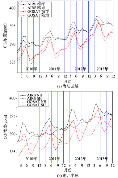 为了进一步阐释AIRS与GOSAT反演的CO2浓度值的时空差异,本文还分别对南北半球及海陆范围的平均CO2浓度进行了对比分析,结果如图2所示。图2(a)为海洋与陆地区域的平均CO2浓度时间序列,由图可知,CO2浓度在海洋及陆地区域的平均值具有相似的时间波动特征,且与全球平均CO2变化一致,CO2浓度值在陆地几乎始终高于海洋,这与人类活动释放大量的CO2密切相关。对于GOSAT而言,在低值月份,即夏末时,海洋区域CO2浓度值高于陆地区域,这可能与GOSAT能探测到的森林生态系统的固碳作用使CO2浓度降低有 关[24]。图2(b)为南半球(NH)与北半球(SH)区域平均CO2浓度的时间序列,由图2可知,CO2浓度的时间序列变化特征,在南北半球存在明显差异,这是因为南半球的季节变化规律与北半球相反[25],此外,由于化石燃料燃烧及土地利用变化等主要集中在北半球,故其CO2浓度高于南半球。
