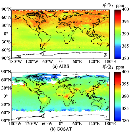 图3展示了AIRS与GOSAT CO2浓度的空间分布结果,数据为2010-2013年的平均值,其中,AIRS的空间分辨率为2°(纬度)×2.5°(经度),GOSAT为2.5°×2.5°。由于二者在空间上差异不大,故本文未将其进行重采样。AIRS反演得到的CO2浓度范围为378.98~418.67 ppm,GOSAT反演的CO2浓度范围为380.96~397.62 ppm。其中,AIRS的CO2浓度大于400 ppm的格网点仅有15个,占总格网数的0.14%,小于380 ppm的格网点仅有1个,这些极值点全部无规律地分布在88°~90°N格网区间内,对CO2浓度的整体空间分布没有影响。因此,图3仅展示了CO2浓度范围为380~400 ppm的空间分布,以探讨AIRS与GOSAT CO2浓度在空间上的分布差异。AIRS探测到的对流层中层CO2浓度,在空间上普遍高于GOSAT探测到的近地面CO2值,这与图1时间序列结果相吻合。AIRS CO2浓度相对混合均匀,其值集中在390~395 ppm,且北半球浓度高于南半球,图2(b)证实了这一点。AIRS的CO2高值区位于30°~90°N,这主要由地面CO2源排放及北半球中纬度大尺度污染带的循环所导致[16,26]。此外,与WDCGG站点CO2测量值的对比研究发现,该区域内的AIRS CO2浓度与其差异较大,进一步说明此高值区域受到了人类排放及大范围陆地生物圈的影响[16]。GOSAT探测到的近地面CO2浓度高值区则位于热带、亚热带人口众多的地域,如非洲和中国东部沿海地区,这与CO2浓度排放受到人为影响息息相关。非洲大陆WDCGG站点较少,此处结论弥补了在对流层中层CO2与近地面站点对比中的不足。故此也说明了GOSAT及其他卫星(如OCO-2),对于探测近地面CO2的重要性。
