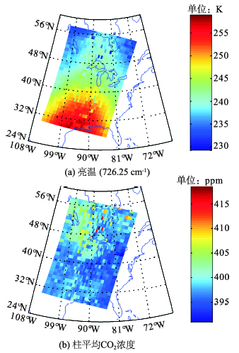 本文采用的是CSPP NUCAPS反演得到的条带产品,其空间覆盖范围为美国东部区域(27°~58°N,69°~105°W),图4(a)为CO2敏感波段726.25 cm-1的亮温分布。在该区域内,亮温呈现南高北低的空间分布特征,空间差异为25 K左右。柱平均CO2浓度在空间分布上则与亮温出现相反的趋势,在亮温高值区,CO2浓度较低;在亮温低值区,CO2浓度较 高(图4(b)),这是由于CO2气体吸收辐射信息的 缘故。
