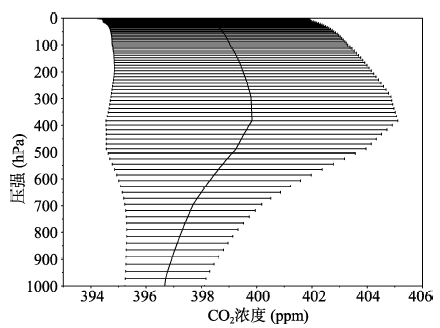 NUCAPS CrIS反演的CO2廓线产品空间分布见图5,该廓线产品所代表的空间区域范围与图4一致,为美国东部区域(27°~58°N,69°~105°W)。每一个垂直高度上的CO2值均为该区域CO2的平均值,且横线表示该区域CO2的标准差,即数据在该区域的离散程度。由图4可知,CO2在垂直分布上具有一定的差异,对流层中层浓度高于近地面CO2浓度,这与上述AIRS与GOSAT的CO2差异一致。在对流层中层以上,CO2垂直差异逐渐减小并趋于稳定。标准差结果表明,尽管该区域内平均CO2在不同高度上差异较小,但是,其空间差异依然十 分显著,最大空间差异出现在对流层中层,约为 10 ppm左右,在对流层中层以上,空间差异较稳定,这与CO2传输至高空垂直混合较均匀有关。近地面CO2在空间分布上差异较小,约为3 ppm,这是由于本文研究区域较小,未涉及到CO2差异较大的源汇分布。