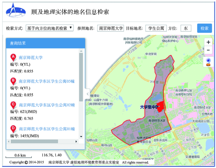 根据表5的统计结果,本文所提出的地名信息检索方法能实现基于属性特征和空间关系的地名信息检索,其查全率和查准率基本都保持在90%以上,F值也相对较高,检索质量优良。对比发现,本文的检索方法在查全率上明显优于对比实验的检索方法,查准率相当,整体检索质量F值优于对比实验。同时,顾及地理实体的地名信息检索最为明显的特点在于顾及了实体的空间特征,无论是从检索的输入形式还是输出形式均表现出实体化的特点,突出了实体间的关联性。本文以“南京师范大学东区的学生公寓”为例来对检索结果进行详细说明。