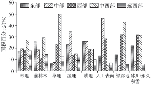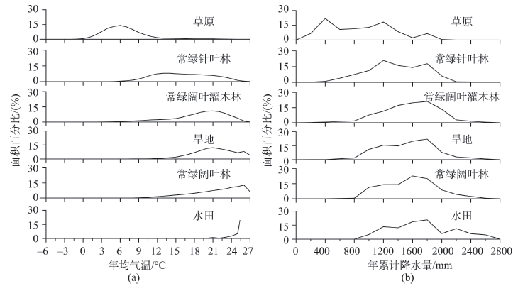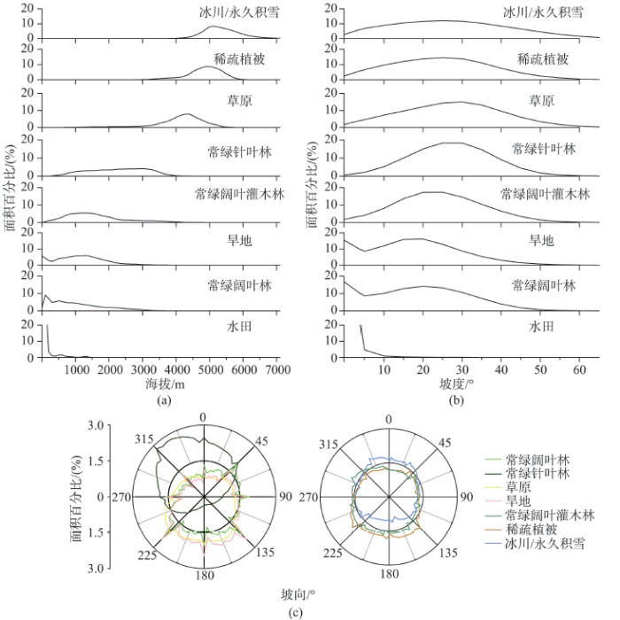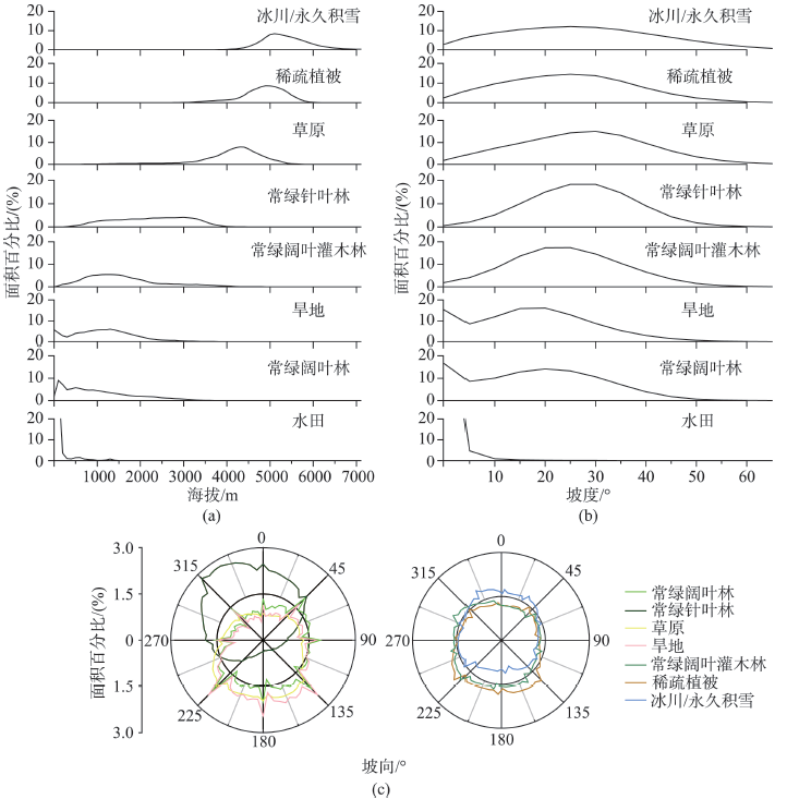 尼泊尔作为兴都库什-喜马拉雅区域的重要组成部分,是一个从平原到山地再到高原的典型过渡地带,具有多样且复杂的土地覆被类型。开展尼泊尔国家尺度的土地覆被研究,对该国的国土资源管理、生态环境保护具有重要的科学和实践意义,同时也能为中国倡导的“一带一路”国际区域经济合作战略提供基础数据保障。本文选用Landsat TM影像为数据源,基于面向对象与决策树相结合的土地覆被遥感制图方法,生产了尼泊尔全境2010年土地覆被产品(NepalCover-2010),该产品包括8个一级类和32个二级类。同时,本文基于Google Earth高分辨率影像获取验证样本开展了NepalCover-2010产品的精度验证工作,并进一步分析了该国土地覆被类型的数量结构特征和空间格局特征与地形、气象要素间的关系。研究结果表明:① NepalCover-2010产品一级类总体分类精度达94.83%,Kappa系数为0.94;二级类的总体分类精度达87.17%,Kappa系数为0.85,能够准确地反映尼泊尔土地覆被类型的空间分布格局,是同类土地覆被产品中精度最好的。② 林地是尼泊尔最主要的土地覆被类型,其面积约占尼泊尔国土面积的41%。耕地次之,其面积占比约为25%,其中水田和旱地的面积分布比例约为2:3。③ 地形和气象要素对尼泊尔的土地覆被类型空间分布格局具有显著影响,自南向北随着地势的抬升,各土地覆被类型出现顺序表现出水田、常绿阔叶林、旱地、常绿阔叶灌木林、常绿针叶林、草原、稀疏植被和冰川/永久积雪的垂直地带性特征。