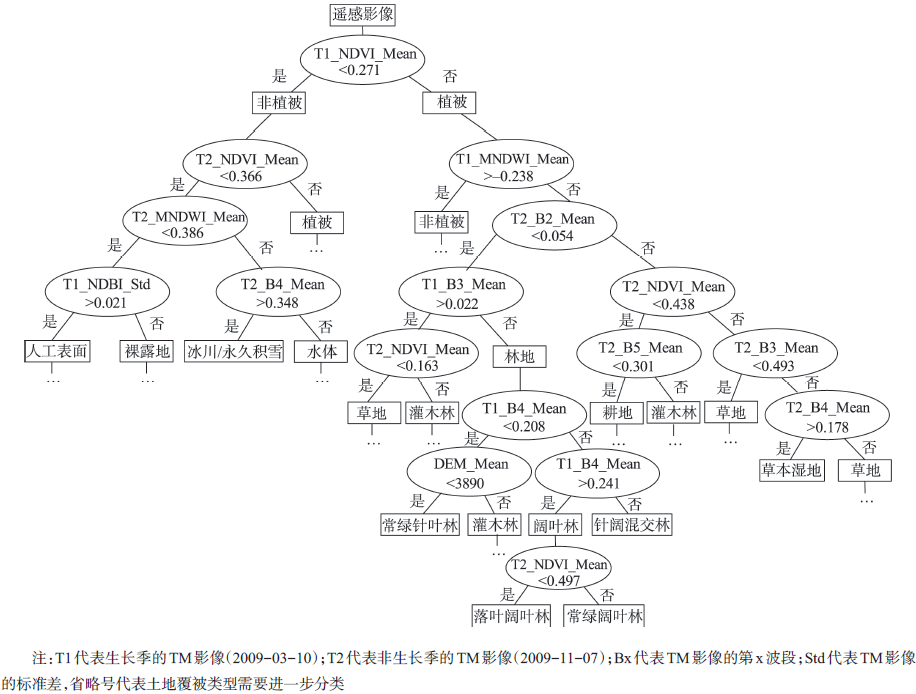 该分类规则集首先将分割后的遥感影像划分为植被和非植被。植被和非植被在生长季遥感影像上NDVI值差异显著,而在非生长季遥感影像上,部分落叶植被和非植被易于混淆,因此研究主要利用NDVI和MNDWI指数来区分植被和非植被。然后,将植被和非植被进一步细分为低一级的土地覆被类型,其中植被细分为林地、灌木林、草地、耕地和草本湿地,非植被细分为人工表面、裸露地、冰川/永久积雪和水体。非生长季耕地和草地的光谱特征与林地和灌木林在绿波段表现出明显的差异,利用T2_B2_Mean特征予以区分。林地在红波段处于“吸收谷”,故利用T1_B3_Mean特征区分林地和灌木林;而非生长季耕地和草地的NDVI值差异显著,利用T2_NDVI_Mean特征予以区分。湿地中的水在近红外波段具有强吸收特性,利用T2_B4_Mean特征可以区分水体和冰川/永久积雪,以及草本湿地。人工表面和裸露地主要依据NDBI指数予以区分。最后,将上述类别再进一步细分到最低一级的土地覆被类型。以林地的细分为例,阔叶林、针叶林和针阔混交林在近红外波段差异最为敏感,同时非生长季遥感影像上常绿、落叶特征的NDVI值差异最为显著,故利用T1_B4_Mean和T2_NDVI_Mean特征进行林地的细分。灌木林、草地、耕地、人工表面、水体和裸露地的细分与林地的细分类似。
