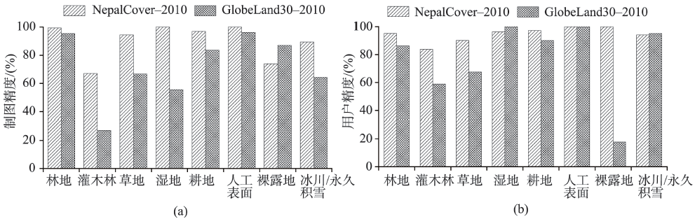 基于面积占优法和重要性法共获得验证样本点1528个(图1),基于该验证样本点建立如表2所示的误差矩阵。NepalCover-2010产品的一级类总体分类精度达94.83%,Kappa系数为0.94;二级类总体分类精度达87.17%,Kappa系数为0.85。制图精度和用户精度均超过二级类总体分类精度(87.17%)的类别包括落叶阔叶林、水田、旱地、河漫滩、居住地和冰川/永久积雪,其中落叶阔叶林的制图精度达到95.51%;旱地的用户精度达到91.88%;河漫滩的制图精度和用户精度达到100%和92.31%;居住地的制图精度和用户精度达到96.30%和100%;冰川/永久积雪的用户精度达到93.16%。