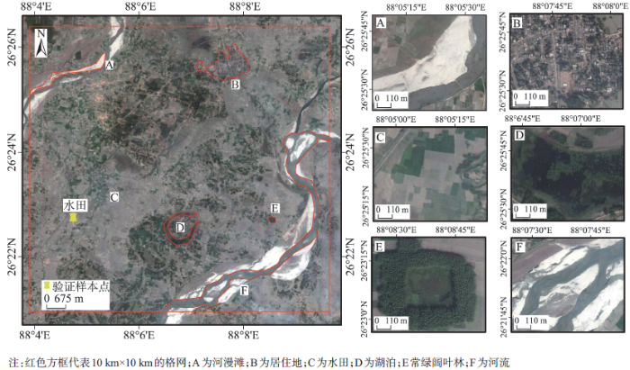 参与精度验证的样本选取主要利用Google Earth高分辨率影像和面积占优法[27]完成。该方法首先将研究区划分成10 km×10 km的格网,然后在每一个格网内,利用Google Earth平台提供的高分辨率影像和图片信息来人工目视判读土地覆被类型,并在格网内选择面积占比最大的土地覆被类型及其分布中心,作为该格网所选土地覆被样本点的类别信息和位置信息。如图4所示,该格网内至少含有6种土地覆被类型,其中水田的面积远大于其他几种土地覆被类型,故在水田的集中分布区选取土地覆被验证样本点。此外,一些在面积上难以占优的土地覆被类型,如河流、河漫滩、居住地,则采用重要性法[27]选取验证样本。为了保证精度验证的客观性,验证样本的选择由经验丰富并了解尼泊尔区域土地覆被特征的制图人员完成。