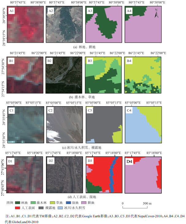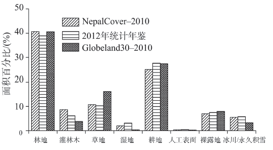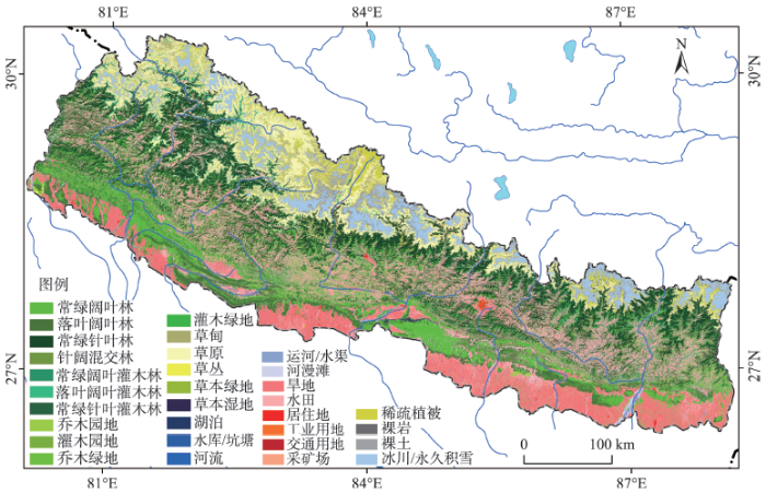 土地覆被信息在全球变化研究中扮演着十分重要的角色,是地球表面多个学科领域研究的基础数据。作为国际山地综合发展中心(International Centre for Integrated Mountain Development,ICIMOD)的服务对象,兴都库什-喜马拉雅区域(Hindu-Kush-Himalayan region)延绵约430万km2,涉及阿富汗、孟加拉国、不丹、中国、印度、缅甸、尼泊尔和巴基斯坦8个国家,区域内多样且复杂的土地覆被直接或间接构成了该地区13亿人口的生计基础,并维持了该地区的生态系统稳定[1]。然而,兴都库什-喜马拉雅区域快速的社会经济发展和独特的自然环境变化时刻影响着该地区的土地覆被状况,并给山区居民的生计和生态系统的稳定带来了极大的挑战[1]。尼泊尔作为兴都库什-喜马拉雅区域的重要组成部分和典型代表[2],开展其国家尺度的土地覆被遥感制图研究,不仅能够提供详实的土地覆被空间分布信息,同时对该国的国土资源开发与管理、生态环境保护与可持续发展具有重要的科学和实践意义[3]。尼泊尔是中国的友好邻邦,在中国大力倡导“一带一路”国际区域经济合作战略的背景下,尼泊尔土地覆被遥感制图研究工作的开展也能为“一带一路”战略提供基础的数据保障[4]。