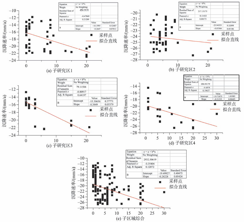 根据以上所获取的建筑物层数数据和地面沉降数据,采用统计分析的方法建立二者之间的关系模型。对每个子研究区均匀采样,获取采样点对应的建筑容积率(楼层数),分别建立各个研究区内所有建筑单元的容积率和地面沉降速率之间的相关模型。同时合并计算所有研究区内建筑单元容积率和地面沉降速率之间的相关关系。
