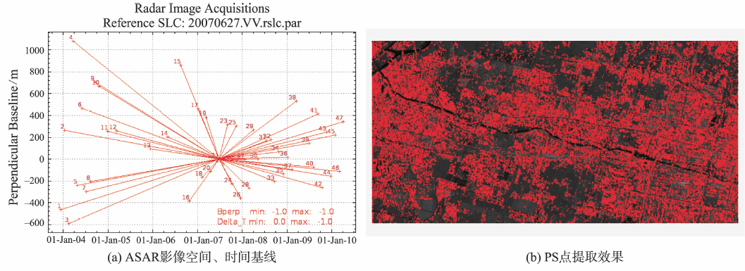 PS点集的计算过程:① 由SRTMDEM去除地形相位,得到PS点对应的模拟地形相位;② 干涉点相位与模拟相位做差得到PS点差分干涉相位;③最小费用流(MCF)方法解缠,获取PS点相位差的整周期数;④ 迭代计算去除轨道误差、大气延迟和 噪声。