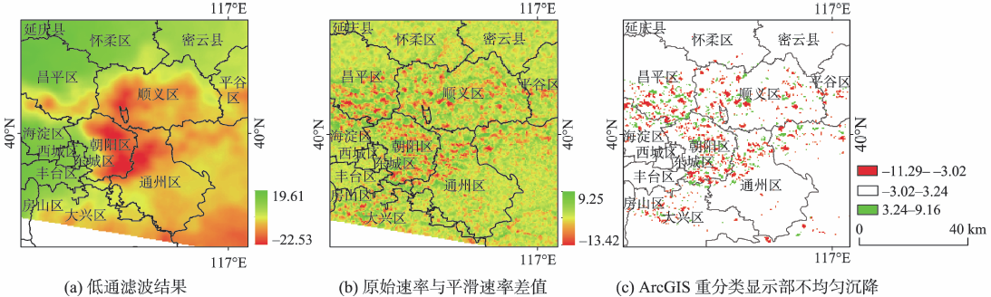 迭代过程中进行解缠时选取海淀区玉渊潭公园内形变量较小的控制点(经度:116.51°,纬度:39.91°)为参考点。大气相位和非线性形变在时间和空间上的频率特征不同:大气相位在空间域上表现为低频信号,时间域上表现为高频信号;非线性形变在空间上相关度较小,时间域上具有低频特征。所以结合时间域和空间域滤波,滤波完成后,利用残余相位与滤波后相位之差可以得到大气和噪声的影响。剩余的部分即为目标非线性形变。将其与线性形变相结合得到PS点的形变信息。