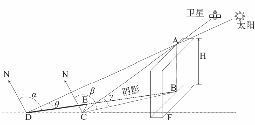 图6 太阳和卫星高度角、方位角与地面建筑阴影的关系