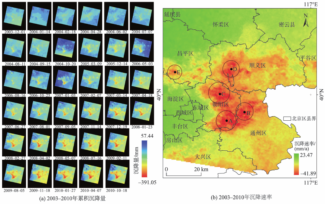 利用ArcGIS空间统计克里金插值及栅格重分类的方法对PS点集的沉降信息进行分析[28],获取北京市平原区2003-2010年的沉降结果(图7)。时序沉降结果(图7(a))反映出北京平原区沉降中心形成的过程。平均沉降速率(图7(b))整体上反映了地面沉降的幅度和趋势,可以得到2003-2010年北京地区的地面沉降比较严重,最大年沉降速率为41.89 mm/a,研究区内沉降速率大于30 mm/a的区域占比高达21.08%;沉降区域主要集中在主城区东部和北部:其中朝阳区,通州北部和顺义的西部最为严重。早期形成的昌平沙河-八仙庄沉降趋势明显,平各庄和天竺沉降漏斗有扩大连接趋势,朝阳区来广营沉降中心向东扩展,东八里庄-大郊亭沉降中心与通州三间房沉降中心有扩大趋势已经连城一片;整体上沉降区域由北向东及东南方向扩展。