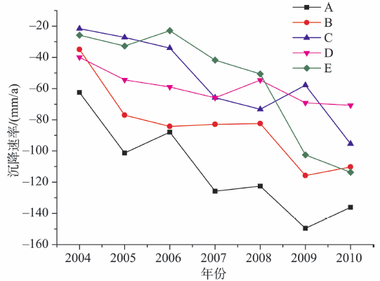 2003-2010年五大沉降区域中心的年平均沉降速率的变化如图8所示,东八里庄-大郊亭沉降中心(A)为沉降速率最大的区域,历年沉降速率都为各个沉降漏斗之最,具有波动性增长的趋势。通州三间房沉降中心(B)2005-2008年沉降速率基本稳定在80 mm/a,2009年沉降速率突然增加。朝阳区来广营沉降中心(C)2003-2006年沉降速率较低保持在30 mm/a左右,2007/2008年和2010年是沉降量增加的年份,整体上呈现波动性增加的趋势。平各庄和天竺沉降中心(D)2003-2010年沉降速率保持在50 mm/a,该区域沉降范围有向东扩展趋势,整体上沉降速率保持不变。昌平沙河-八仙庄沉降中心(D)的沉降速率变化可以得到该沉降区域发生晚于其他沉降区域,2006年之前沉降速率保持在20~30 mm/a,2006-2010年沉降速率逐年增加,是沉降速率增加最快的区域,增量可达20 mm/a。