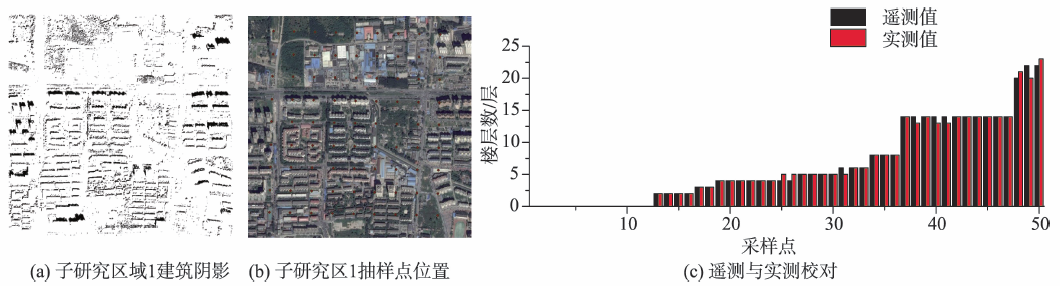 针对研究区1,均匀布置100个样本点,随机选取50个样点进行验证(图9(c)),统计结果显示:准确测得楼层样点所占的比例高于80%。遥测值与实际值之间误差占实际值比重极低,8个采样点建筑体存在1层的偏差,一个采样点存在2层偏差。可以得到遥感值与实际值之间的差异可以忽略,采用阴影法获取建筑物楼层数的方法具有较高的准确度。