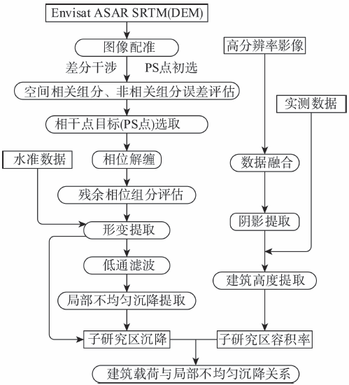 首先,利用2003-2010年48景Envisat ASAR数据通过PS-InSAR技术方法,通过瑞士的GAMMA软件IPTA(Interferometric Point Target Analysis)模块进行图像的配准、差分干涉、干涉点目标提取、相位解缠、形变提取等过程,获取北京市平原区时序地面沉降信息[26];并采用水准监测的沉降值进行验证。在此基础上,选用kriging插值方法对所有PS点的沉降值进行空间插值,得到研究区沉降速率分布栅格图(90 m分辨率);GIS空间分析的方法确定局部不均匀沉降区的位置,选取具有代表性的4个子研究区域。此时,使用高分辨率光学影像提取各个子研究区内建筑单元体的阴影信息,建立建筑高度、阴影长度、太阳高度角、太阳方位角、卫星高度角、卫星方位角之间的函数关系,进而计算建筑物高度获取建筑容积率;并以实际采样的准确数据验证遥感结果的准确度,进而得到研究区各建筑单元体的层数。最后,建立子研究区建筑载荷和地面沉降之间的回归模型,对其结果进行分析。