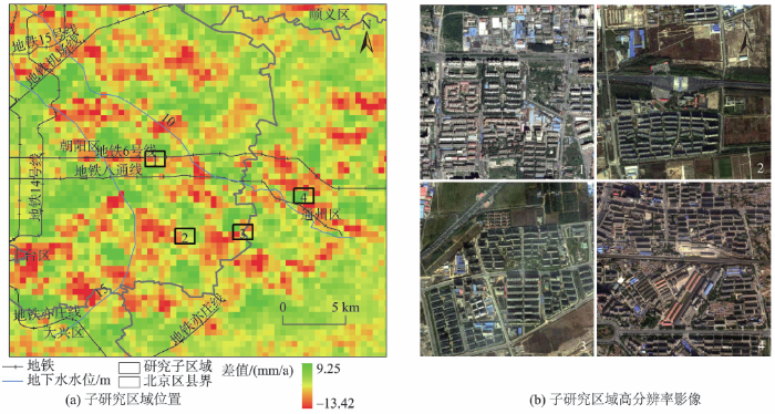 地面沉降是由多种因素引起的地面标高缓慢降低的环境地质现象,近年来已经成为影响全球多个国家可持续发展的严重地质灾害[1]。华北平原北部是中国地面沉降严重区域[2],尤其是特大城市北京[3-4],在其城市发展的过程中面临着地下水常年超量开采、工程建设动静载荷等地面沉降诱发因素的作用。地面沉降对基础设施和人们的生产、生活造成了严重的影响[5],获取准确的地面沉降监测信息,分析其演化规律,讨论建筑载荷与地面沉降之间关系是地面沉降防控的重要依据[6]。